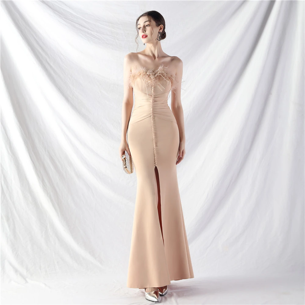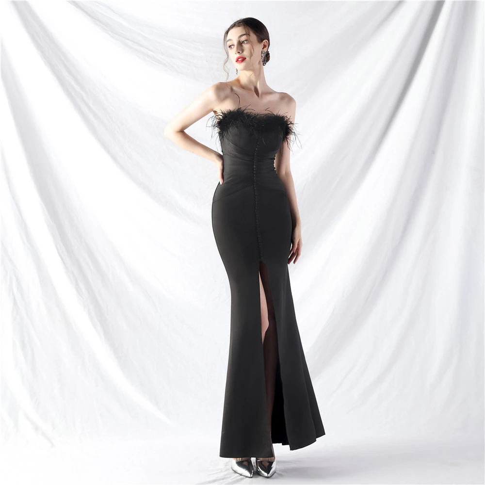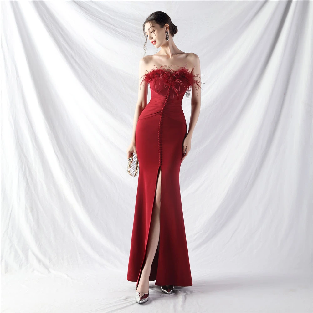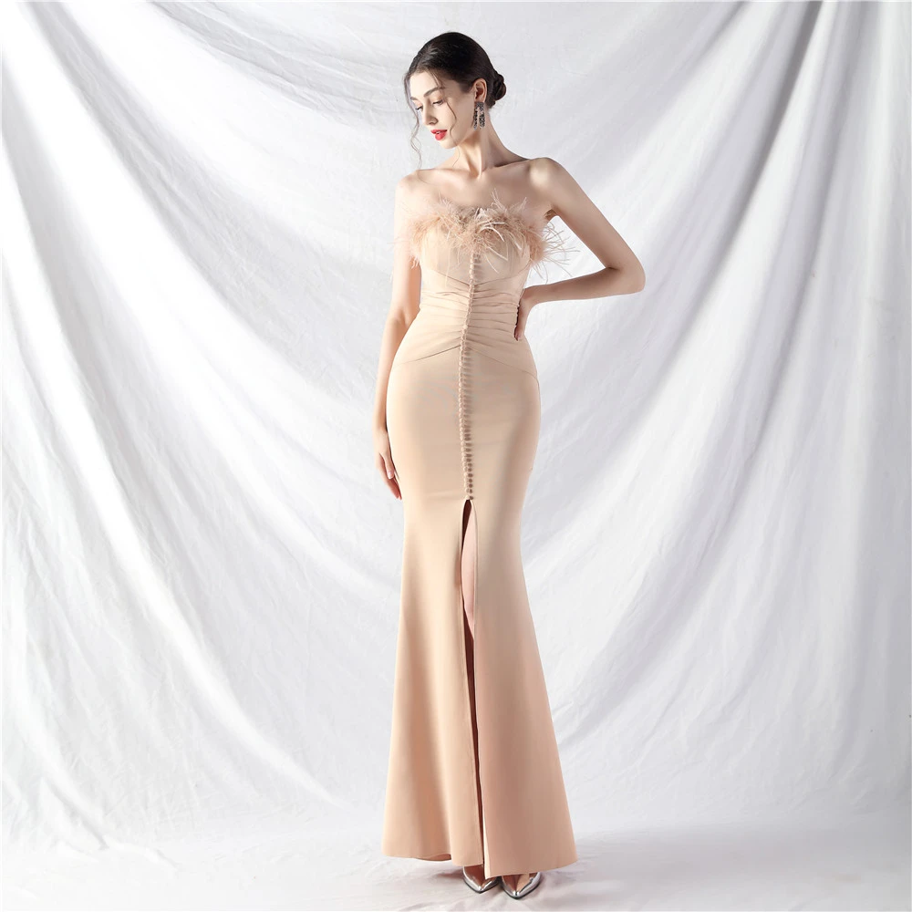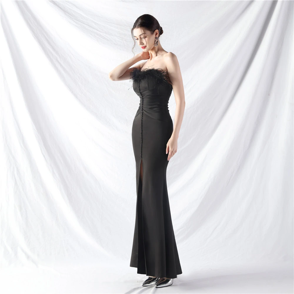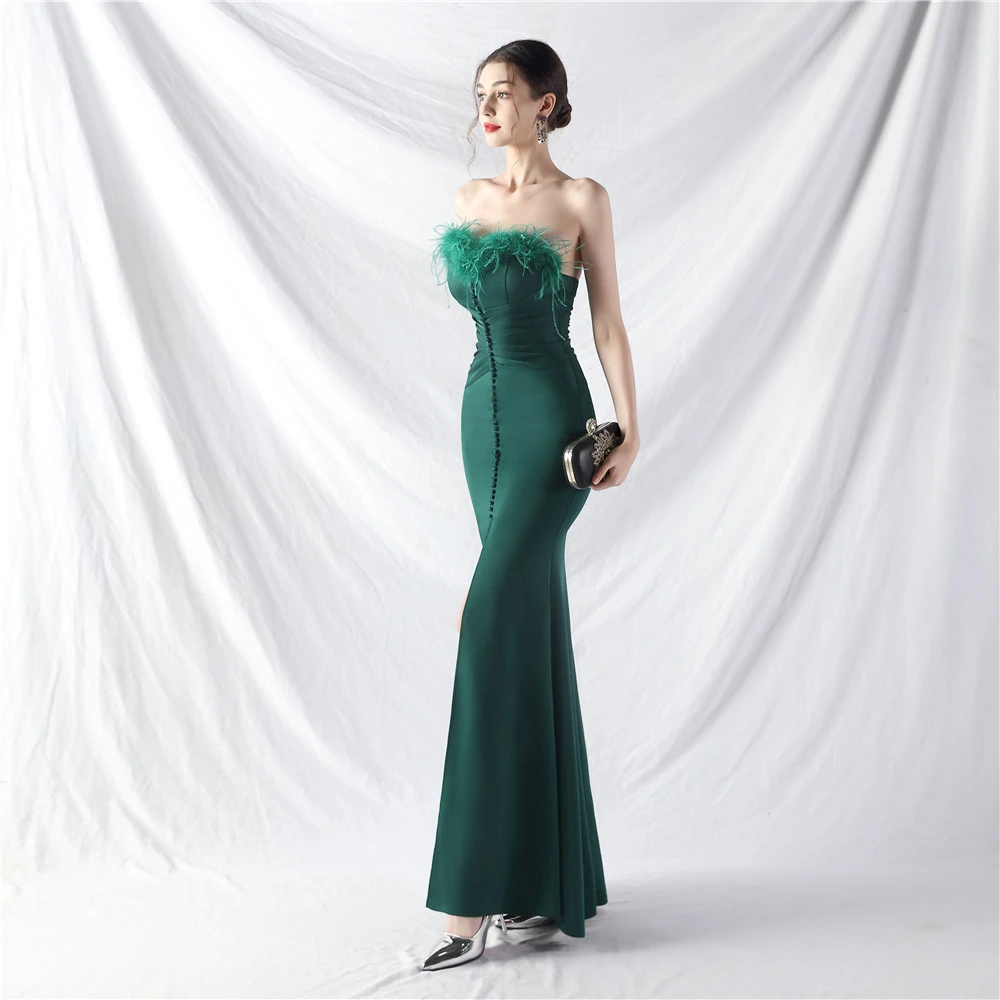 Artistic Buckle Hand-Made Ostrich Feather Satin Long Evening Dress