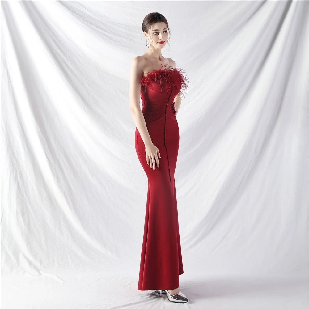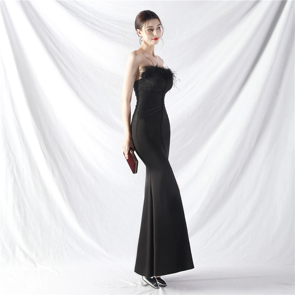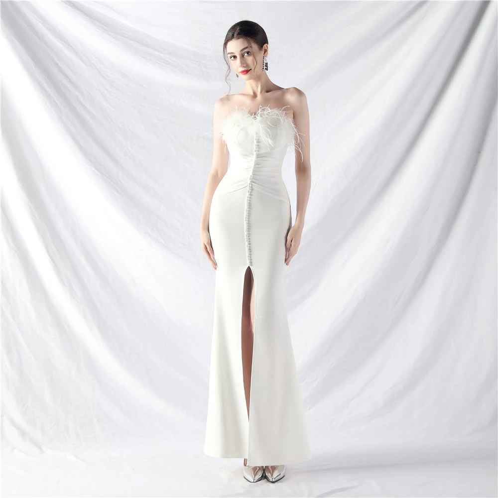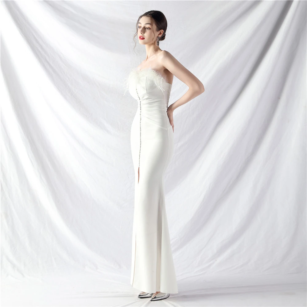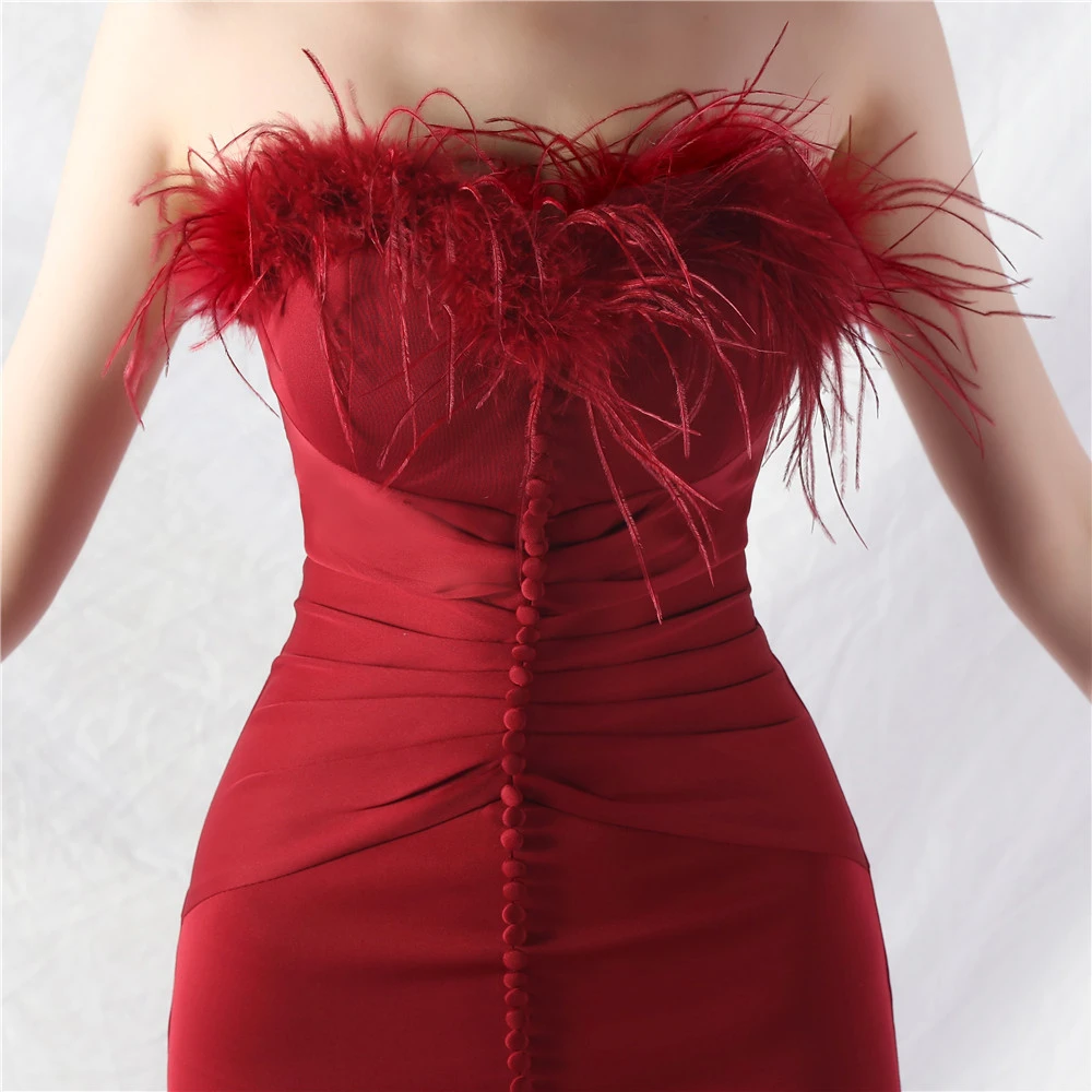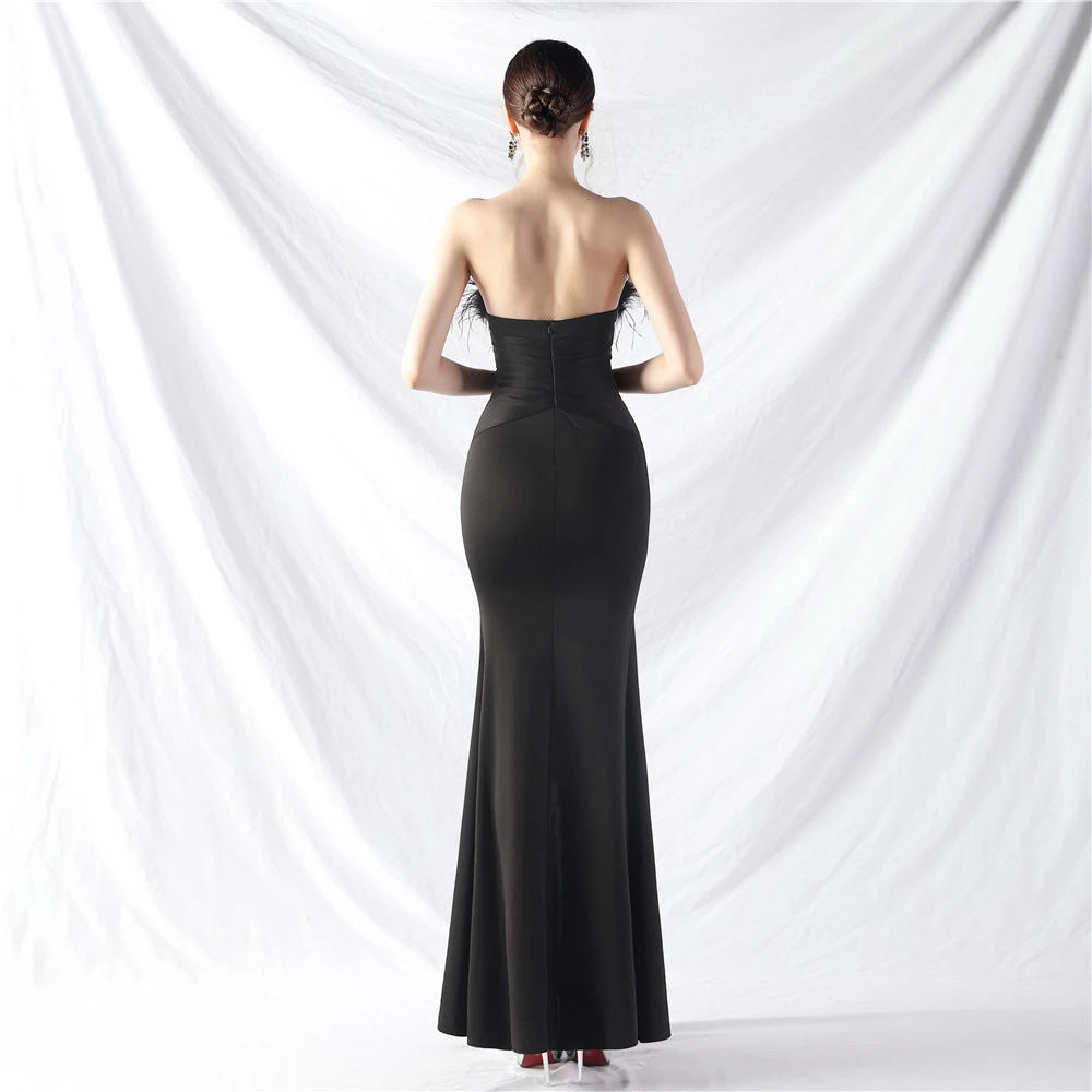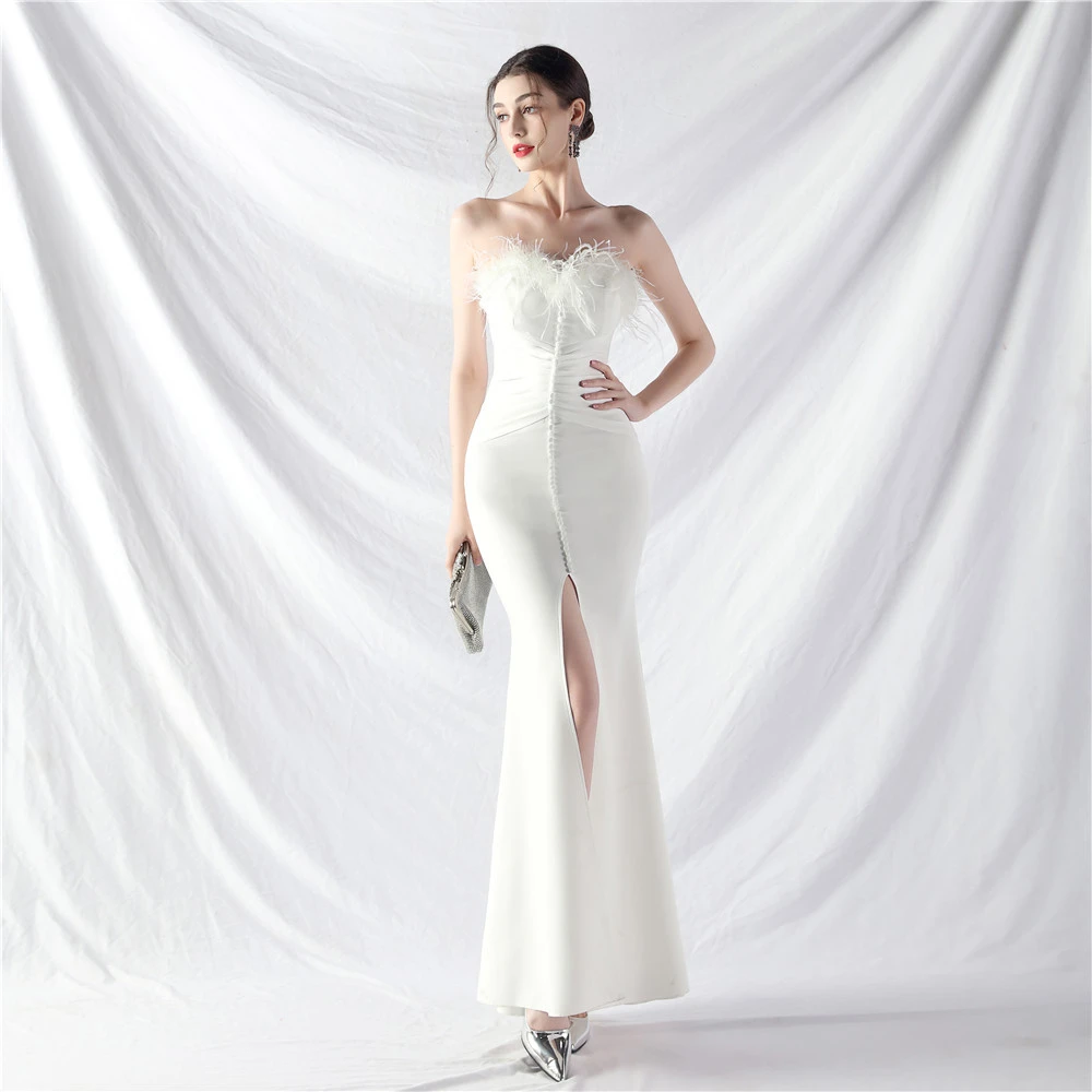 Artistic Buckle Hand-Made Ostrich Feather Satin Long Evening Dress