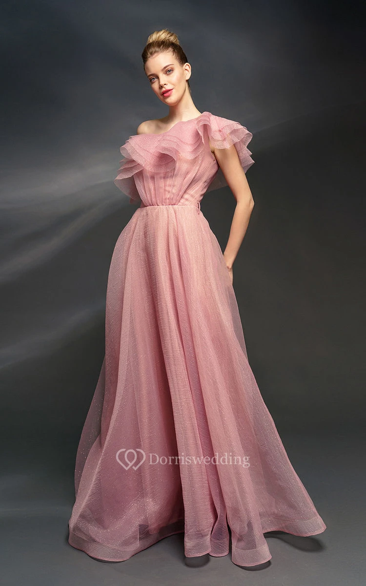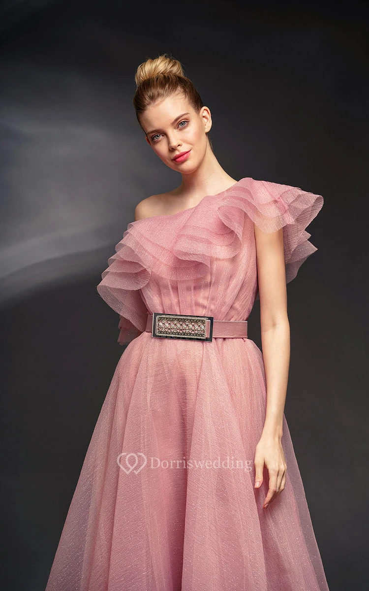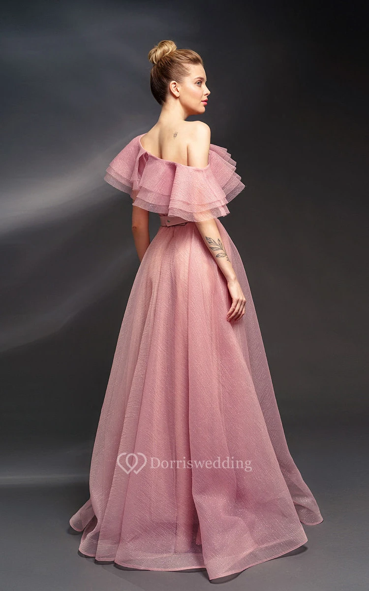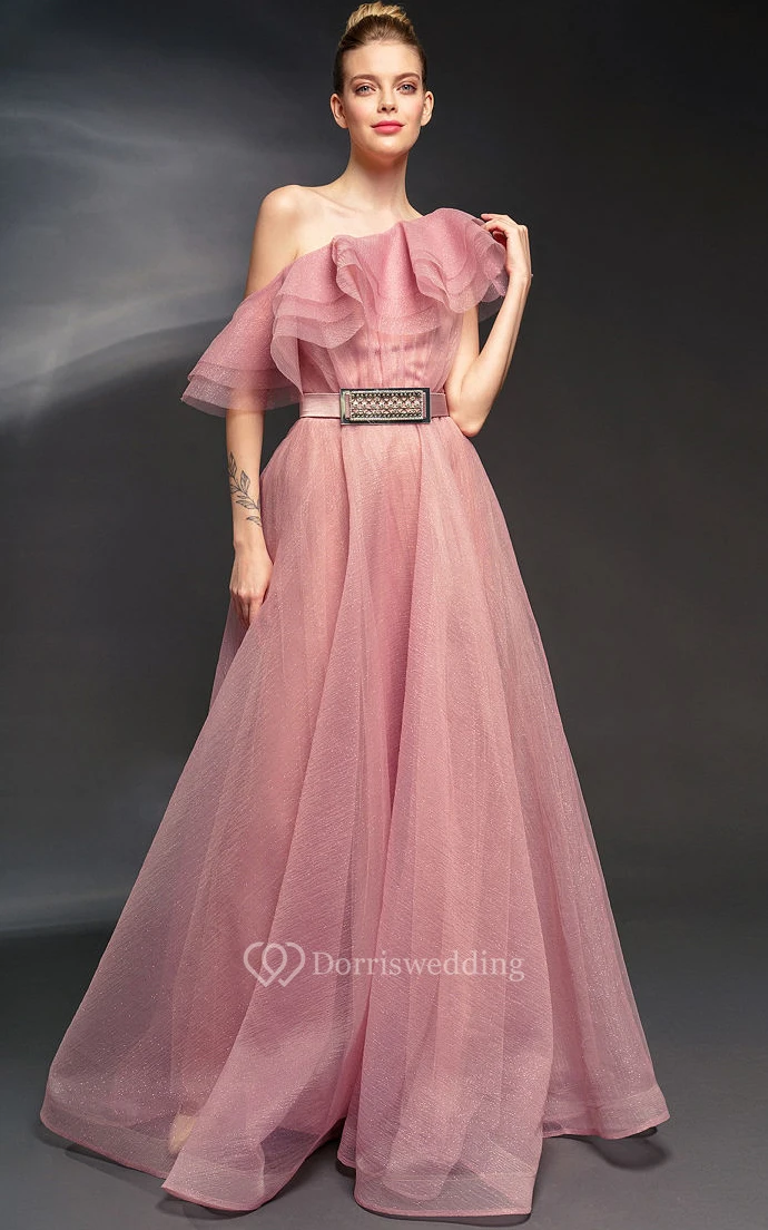 Asymmetrical Off-the-shoulder A-line Tulle Dress with Tiers