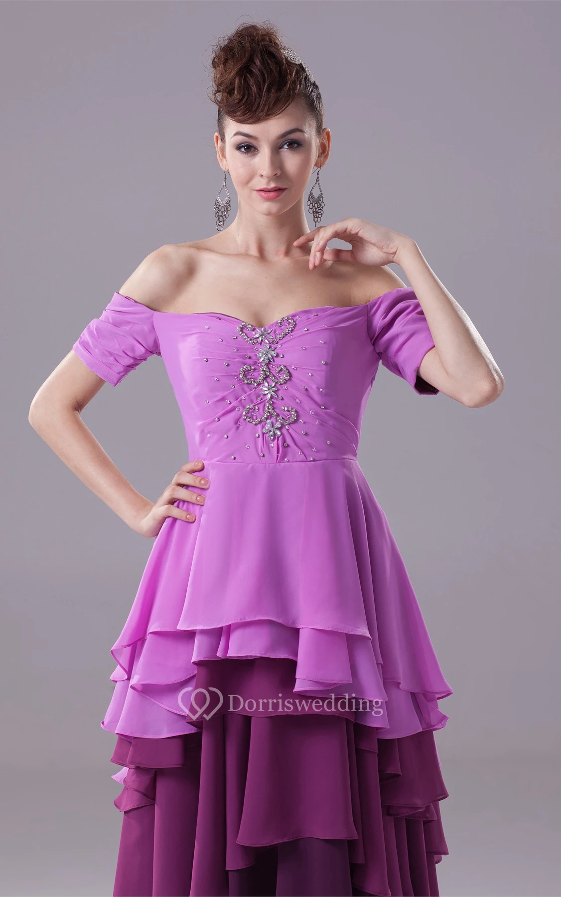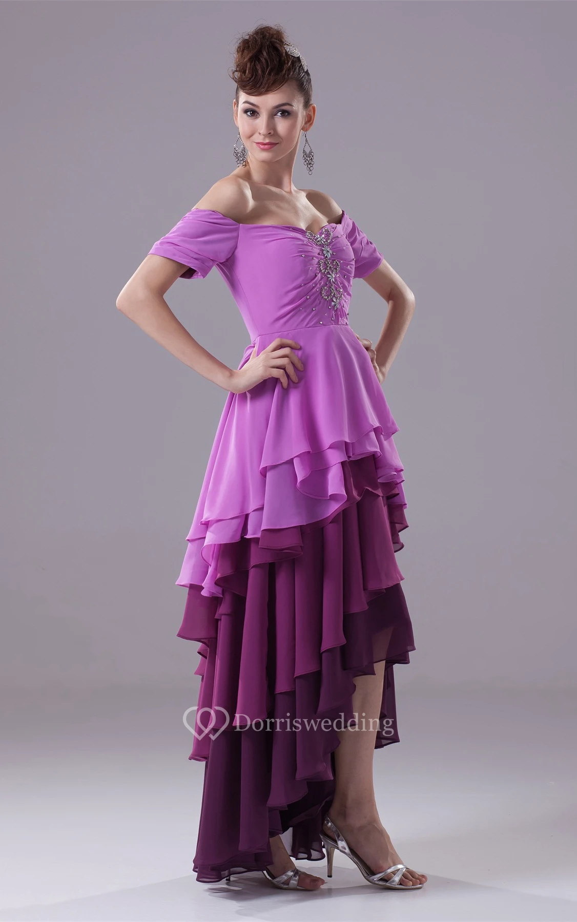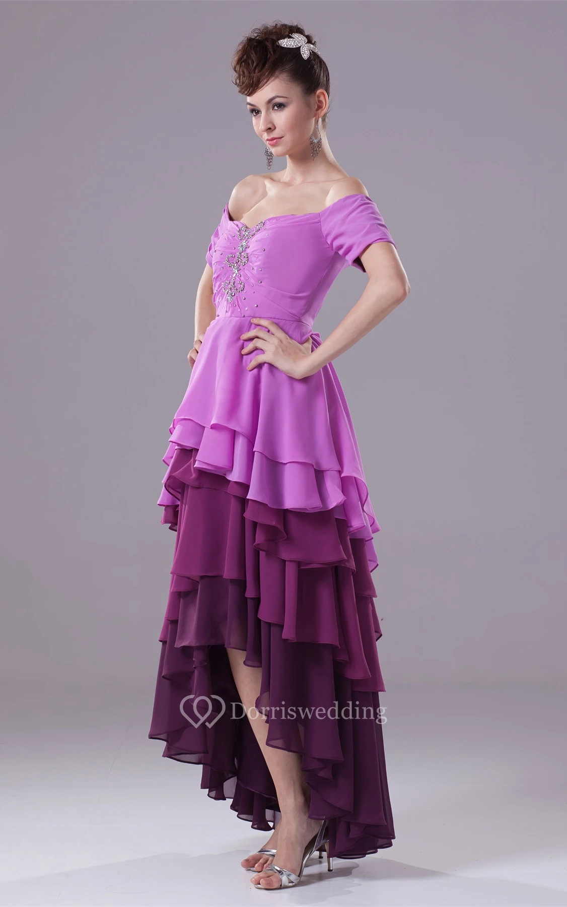 Asymmetrical Off the Shoulder Sleeveless Gown With Tiered Ruffle and Beadings