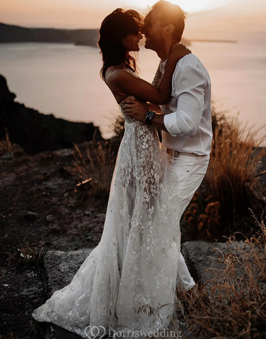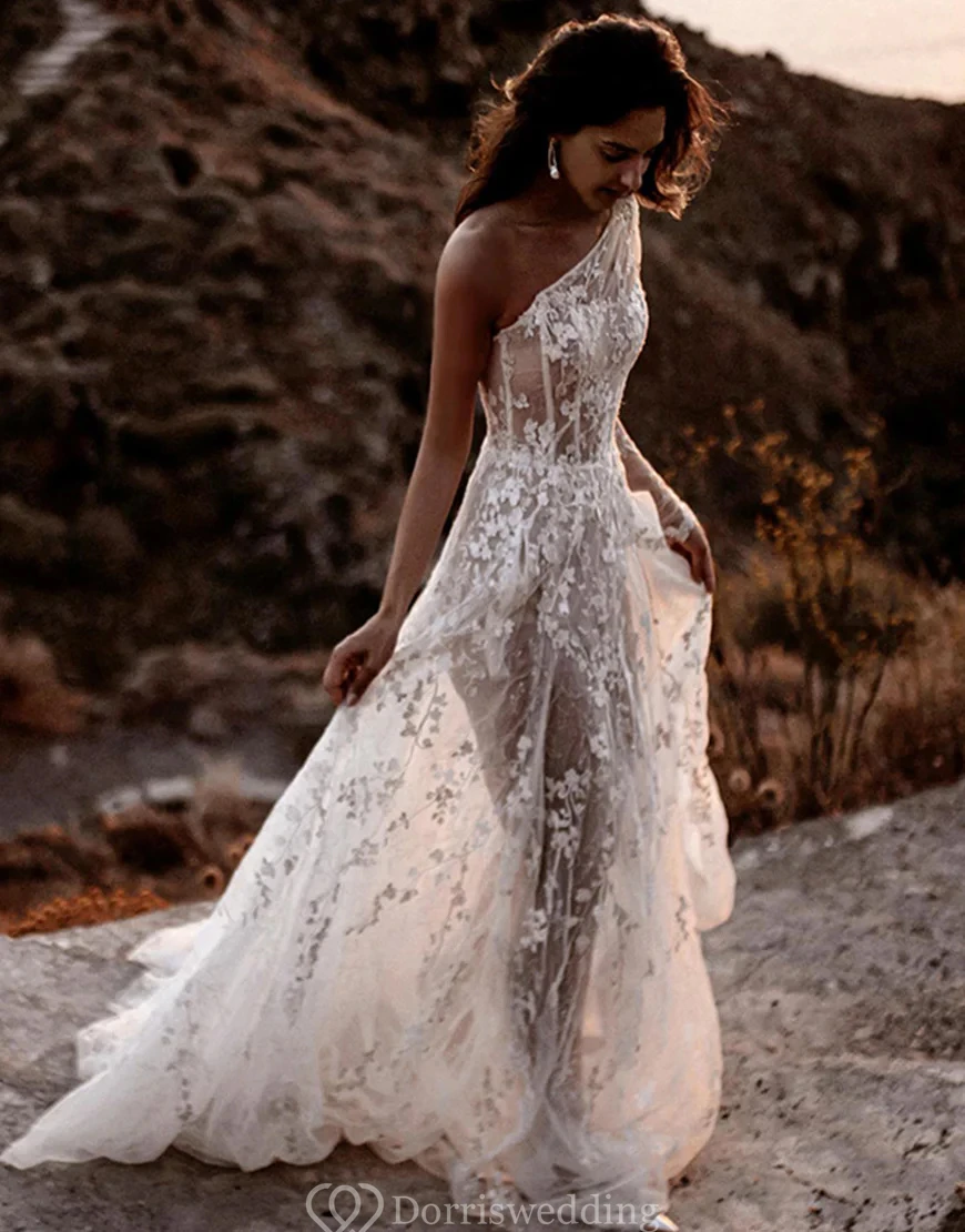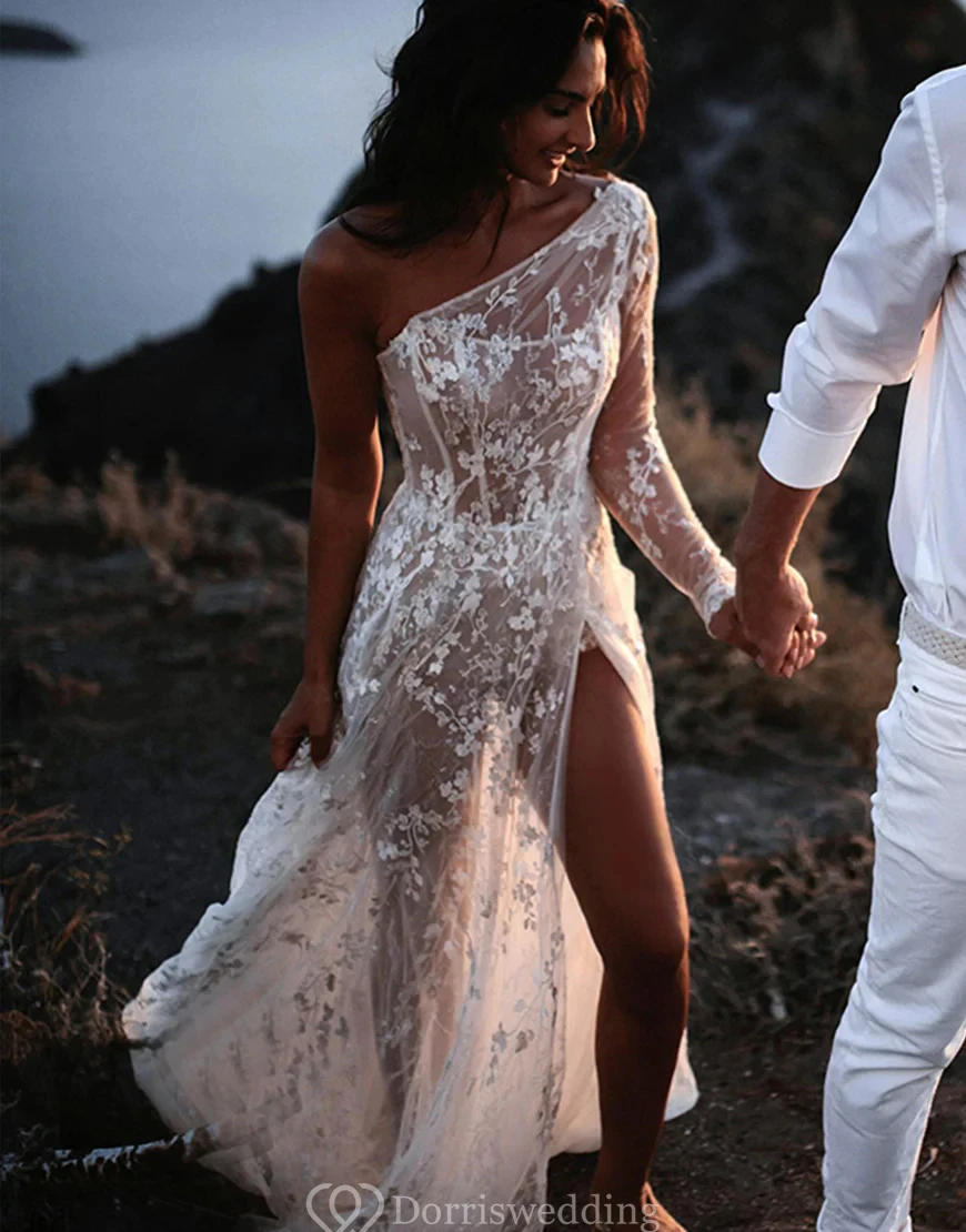 Stand out in this asymmetrical one-shoulder lace wedding dress, designed with a daring thigh-high slit and a flowing train. The illusion bodice and delicate floral detailing offer a romantic feel, perfect for outdoor or destination ceremonies. ✨ Features: One-Shoulder Neckline, Illusion Bodice, Thigh-High Slit, Floral Lace Detailing, Flowing Train. Ideal for adventurous brides seeking a modern twist.
