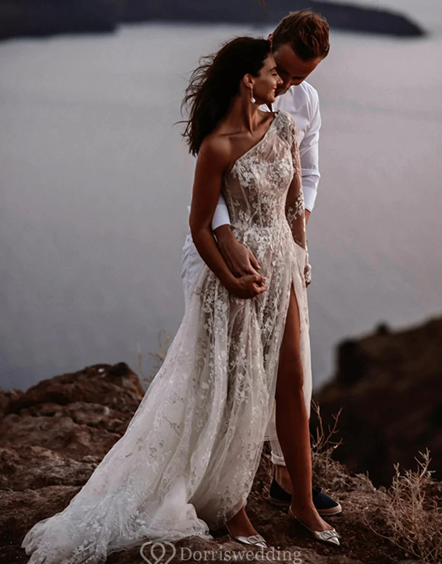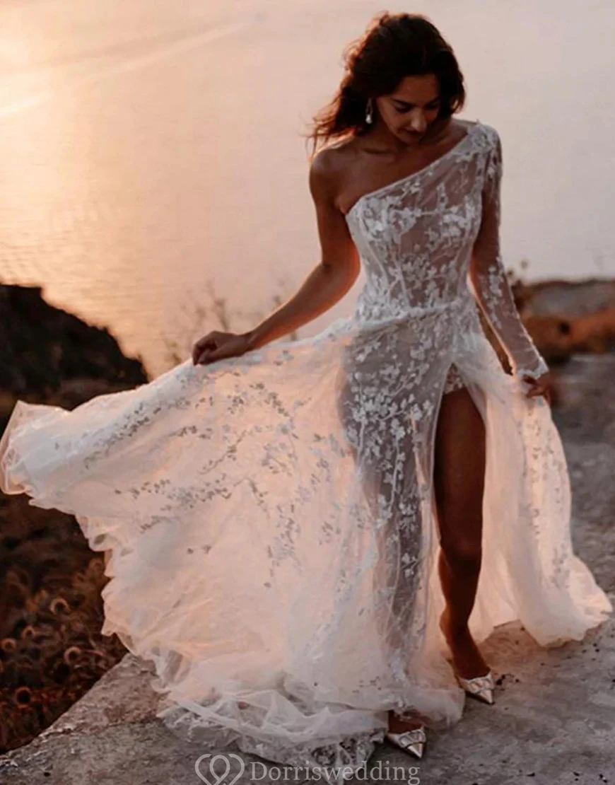 Asymmetrical One-Shoulder Lace Wedding Dress with Thigh-High Slit