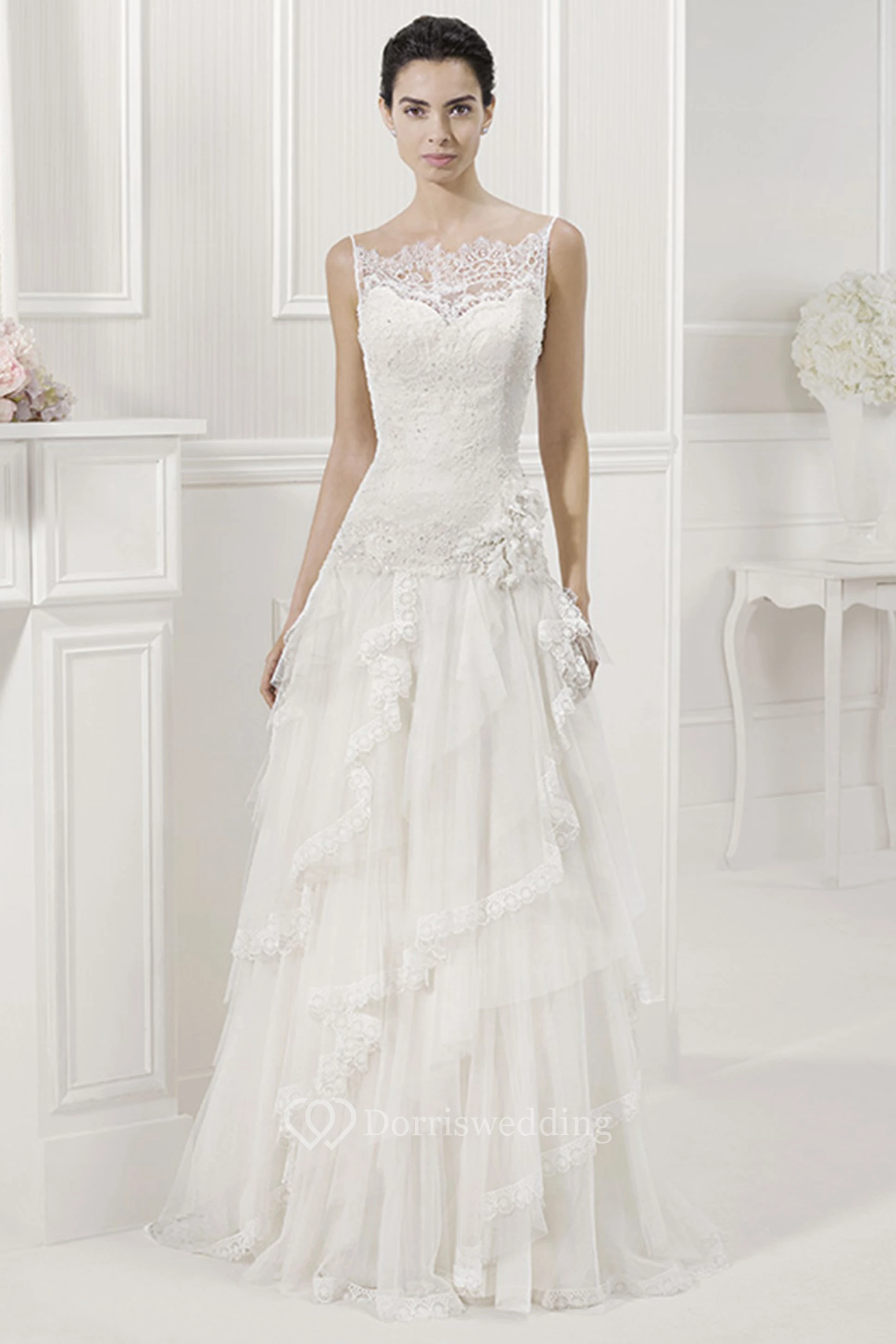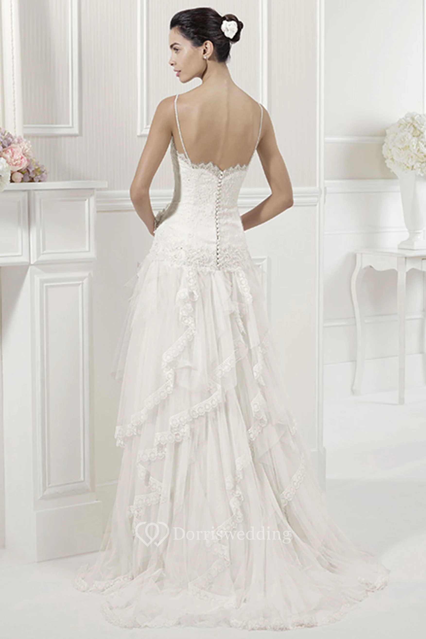 Back Spaghetti Straps Bridal Gown With Sequined Lace Top And Layered Skirt