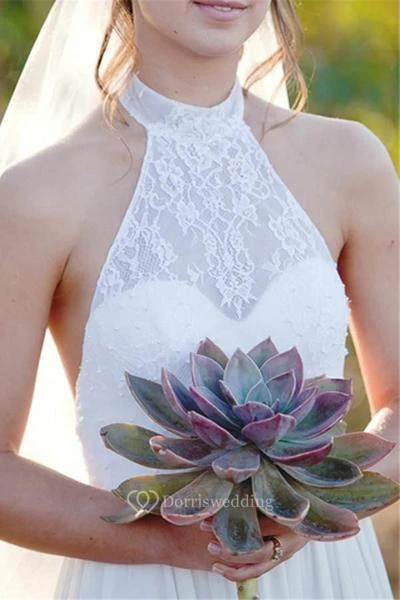 Backless Halter Lace A-line High Neck Chiffon Wedding Dress
