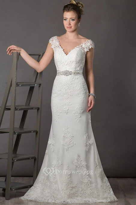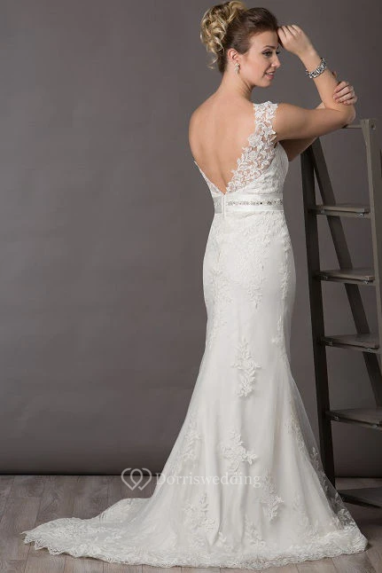Backless V Neck Cap Sleeve Appliqued Mermaid Bridal Gown With Crystal Sash