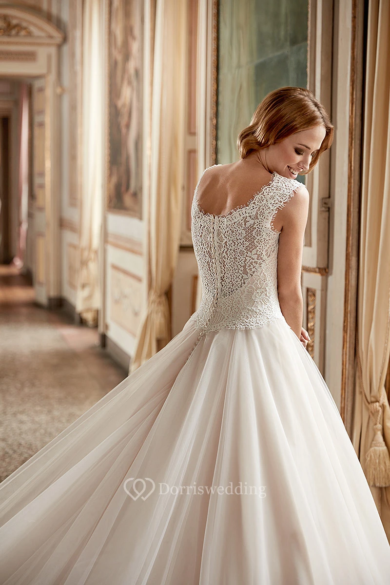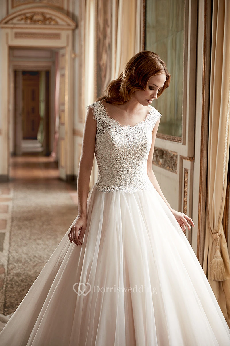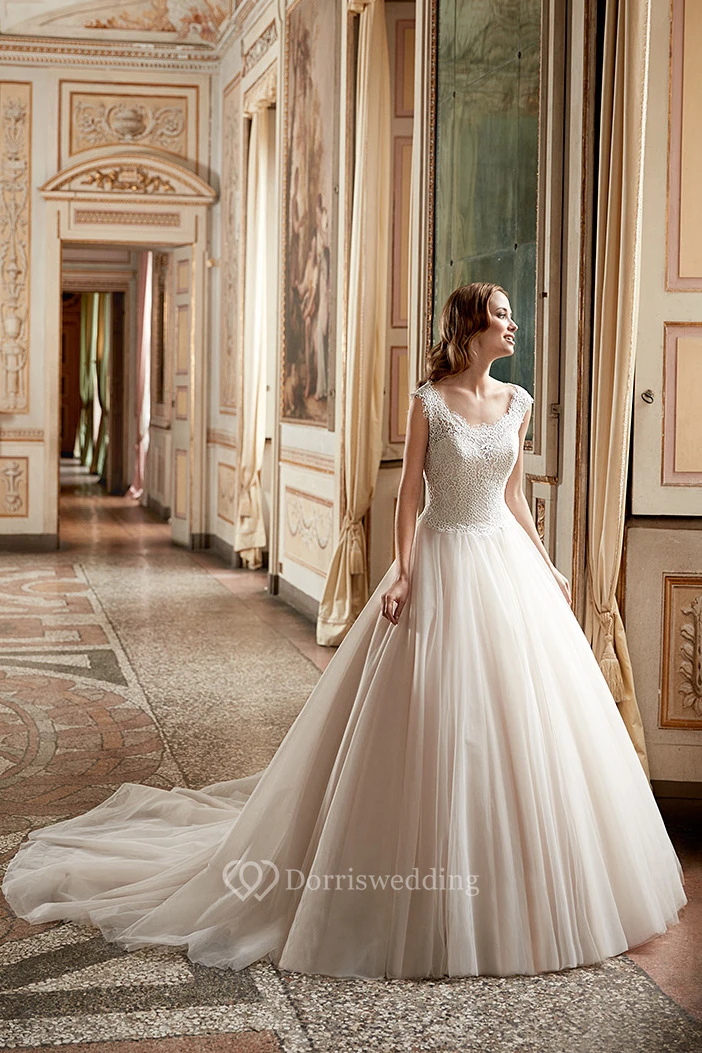 Ball Gown Appliqued Scoop-Neck Cap-Sleeve Maxi Tulle Wedding Dress With Pleats