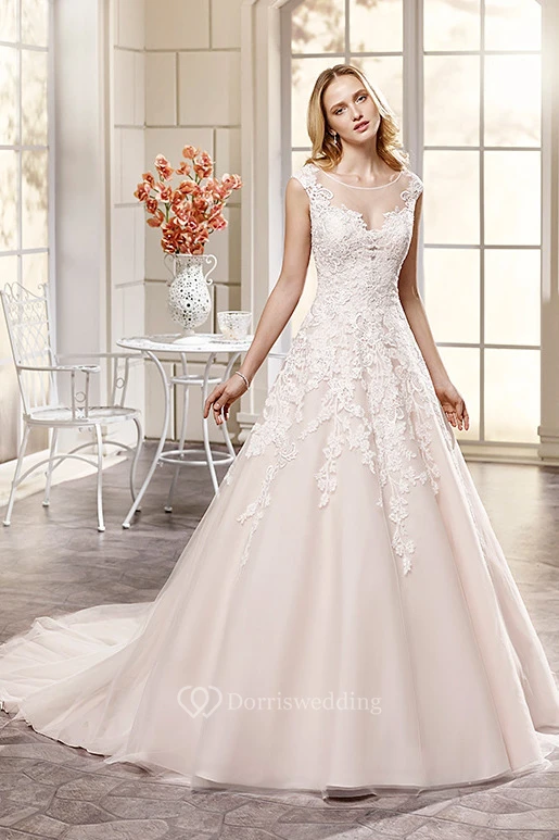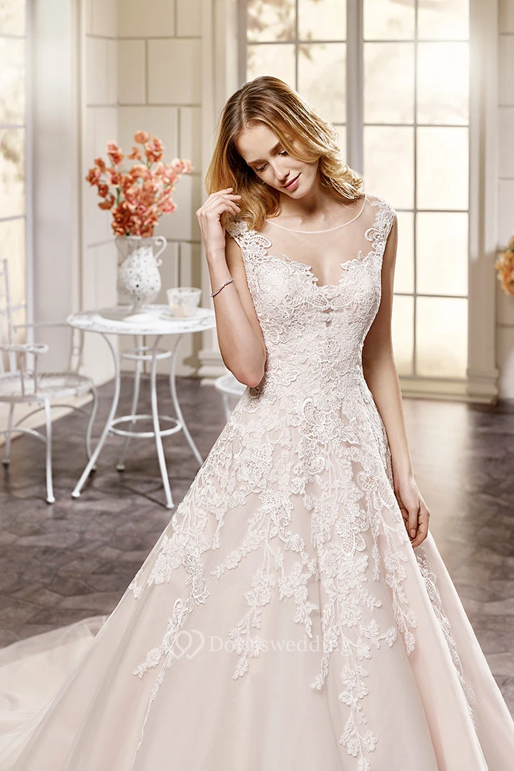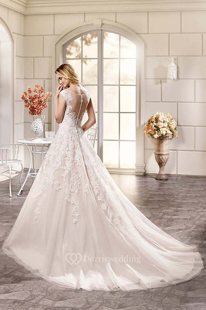 Ball Gown Appliqued Scoop-Neck Maxi Cap-Sleeve Lace Wedding Dress