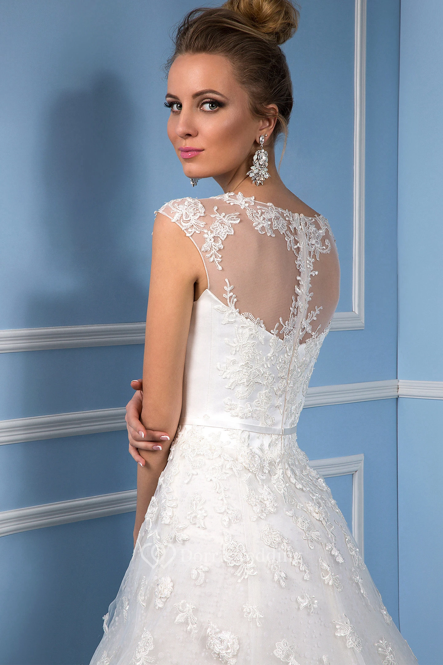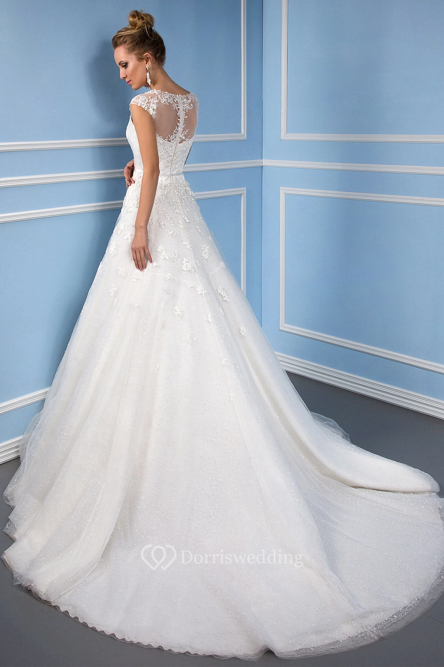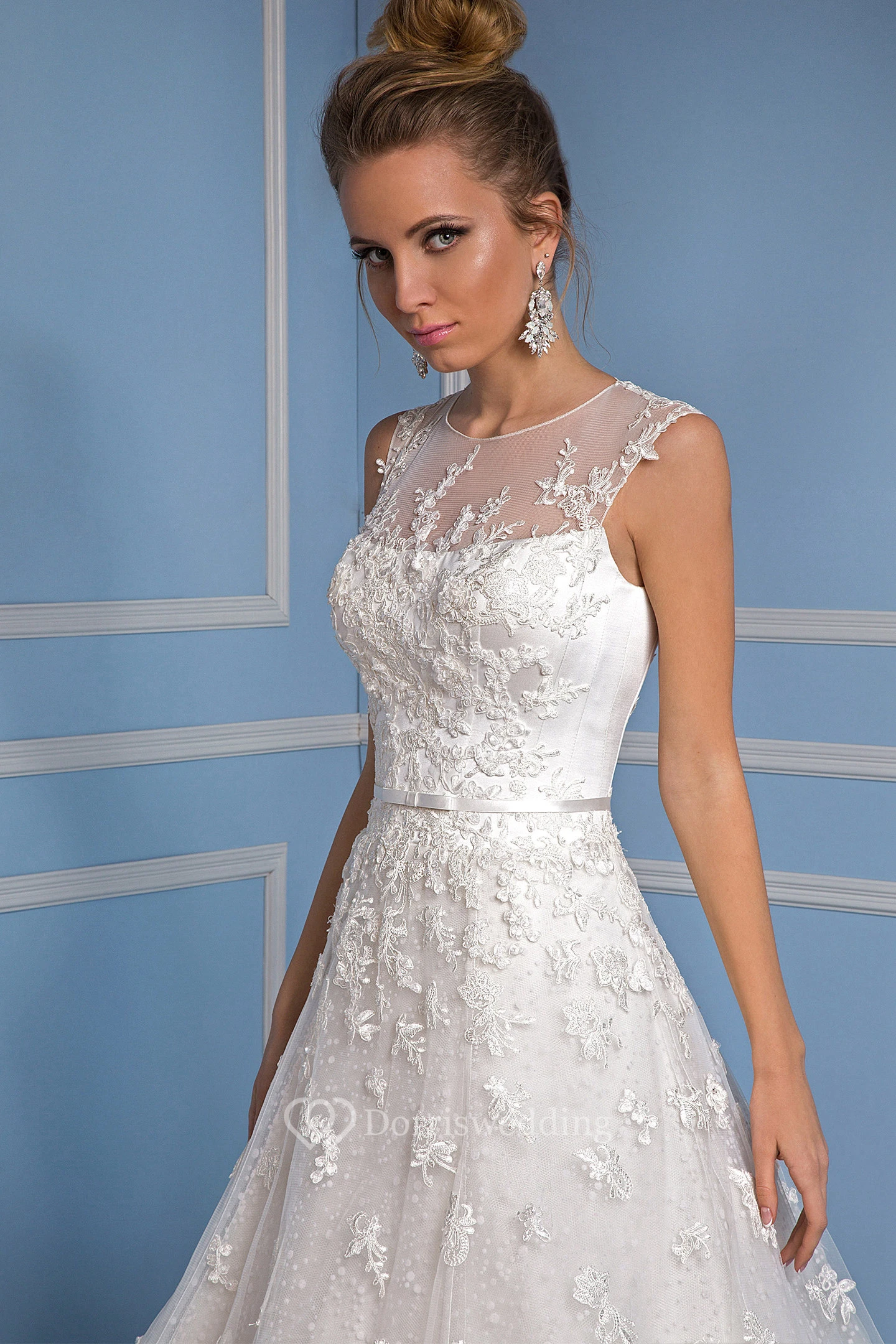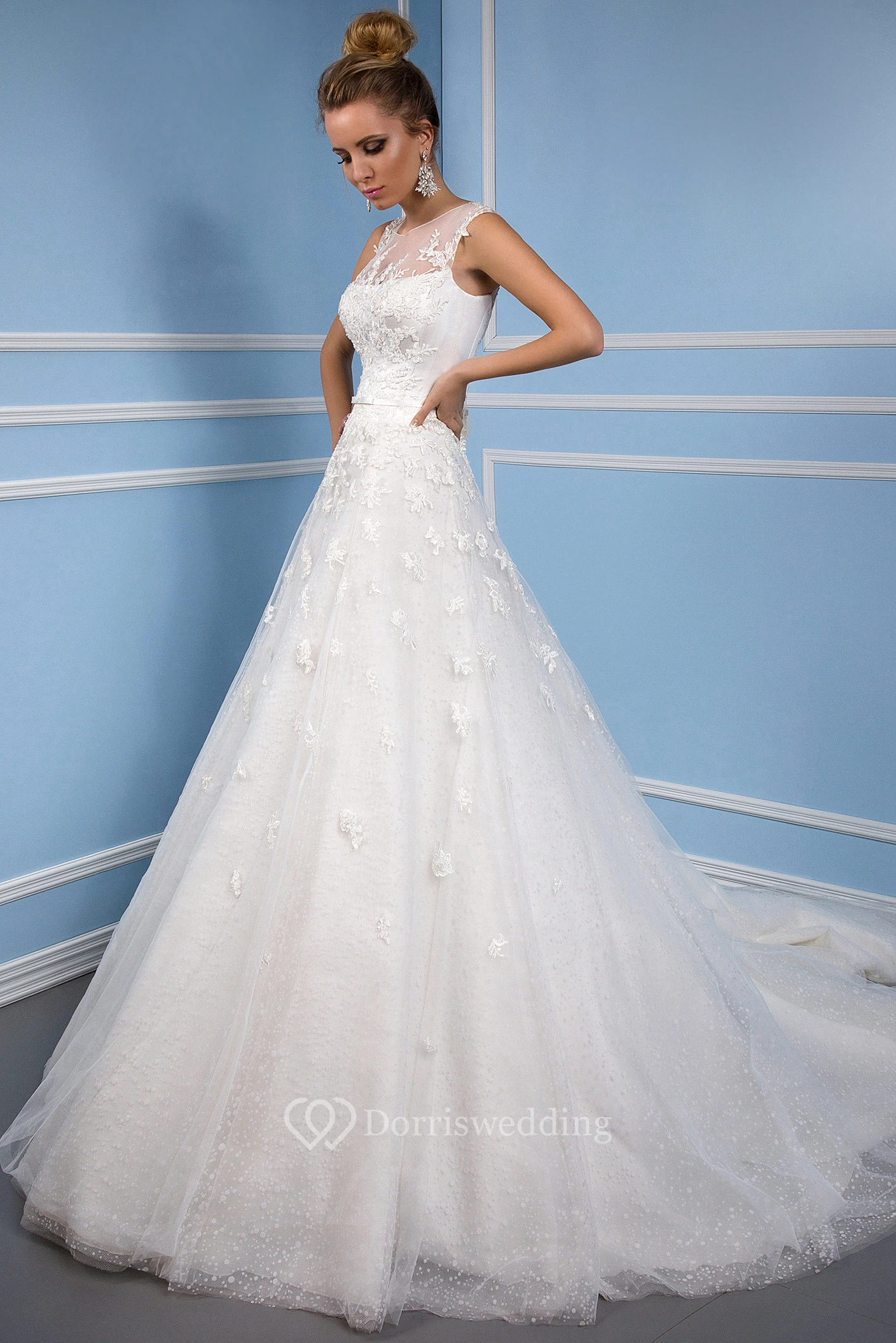 Ball-Gown Appliqued Sleeveless Floor-Length Scoop Tulle Wedding Dress With Illusion Back And Court Train