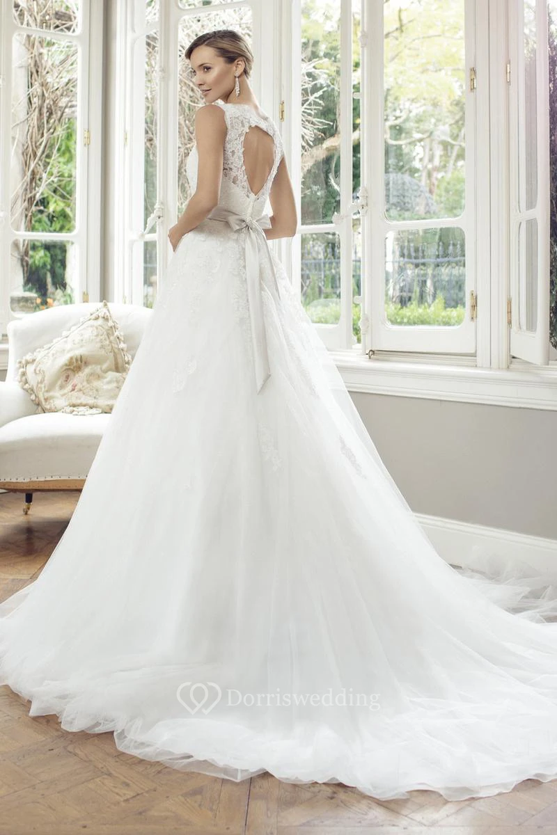 Ball-Gown Appliqued Sleeveless V-Neck Long Lace&Tulle Wedding Dress With Waist Jewellery And Bow