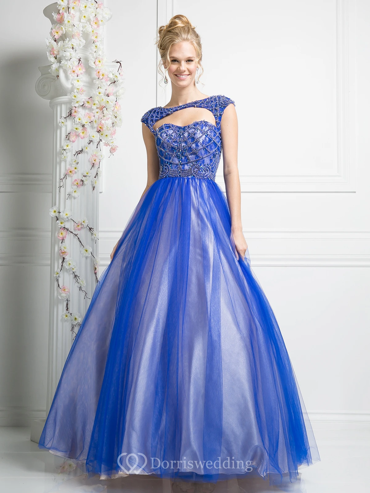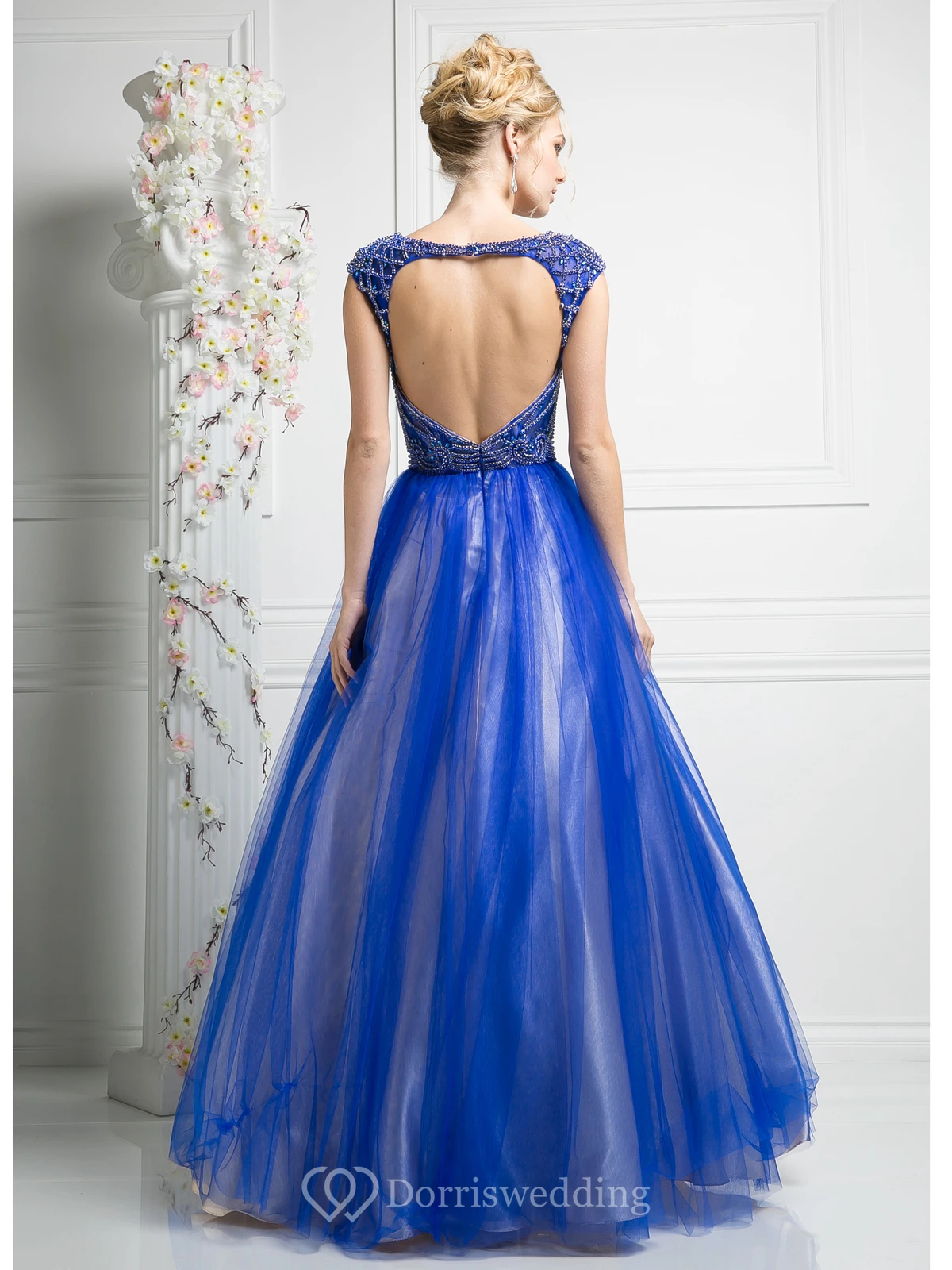 Ball Gown Bateau Cap-Sleeve Tulle Satin Keyhole Dress With Beading