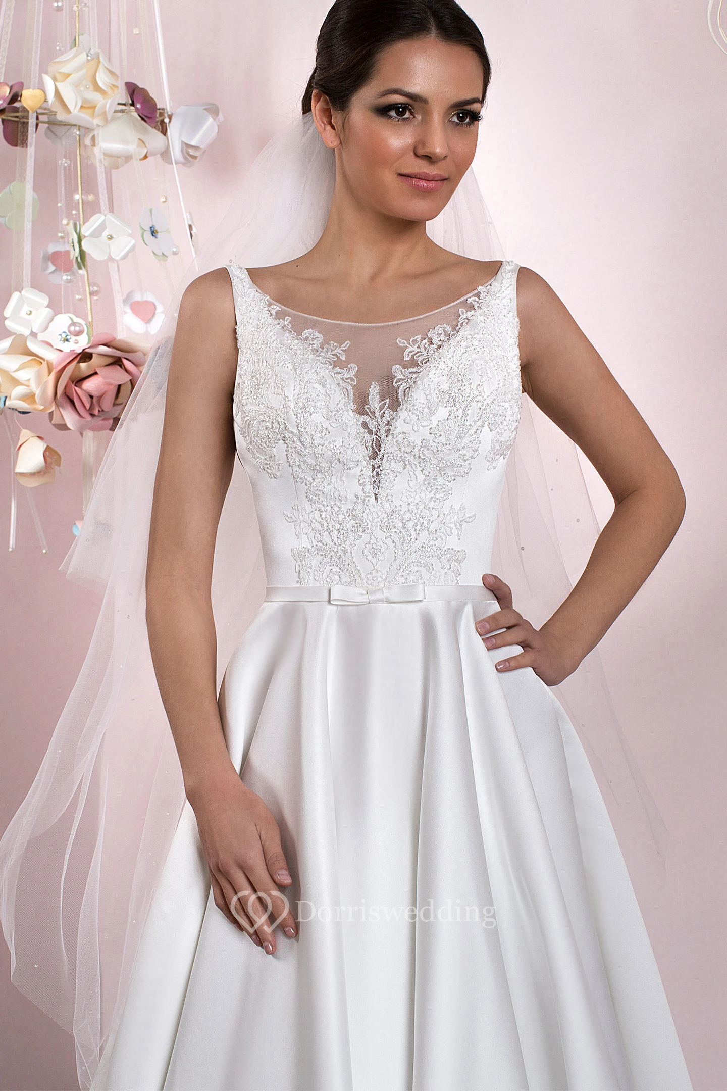 Ball-Gown Bateau Lace Sleeveless Floor-Length Satin Wedding Dress With Deep-V Back And Pleats