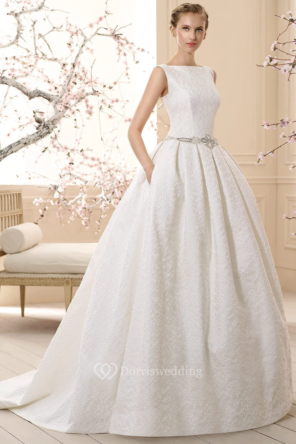 Ball Gown Bateau-Neck Sleeveless Long Jeweled Wedding Dress With Embroidery