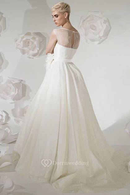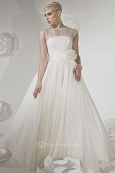 Ball Gown Bateau-Neck Tulle Wedding Dress With Flower And Illusion