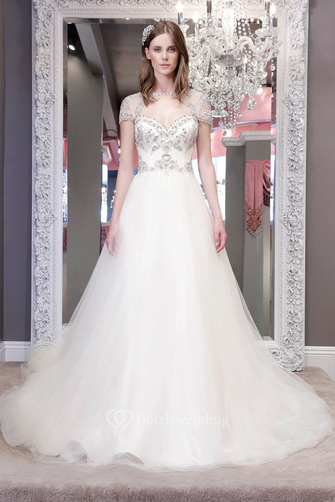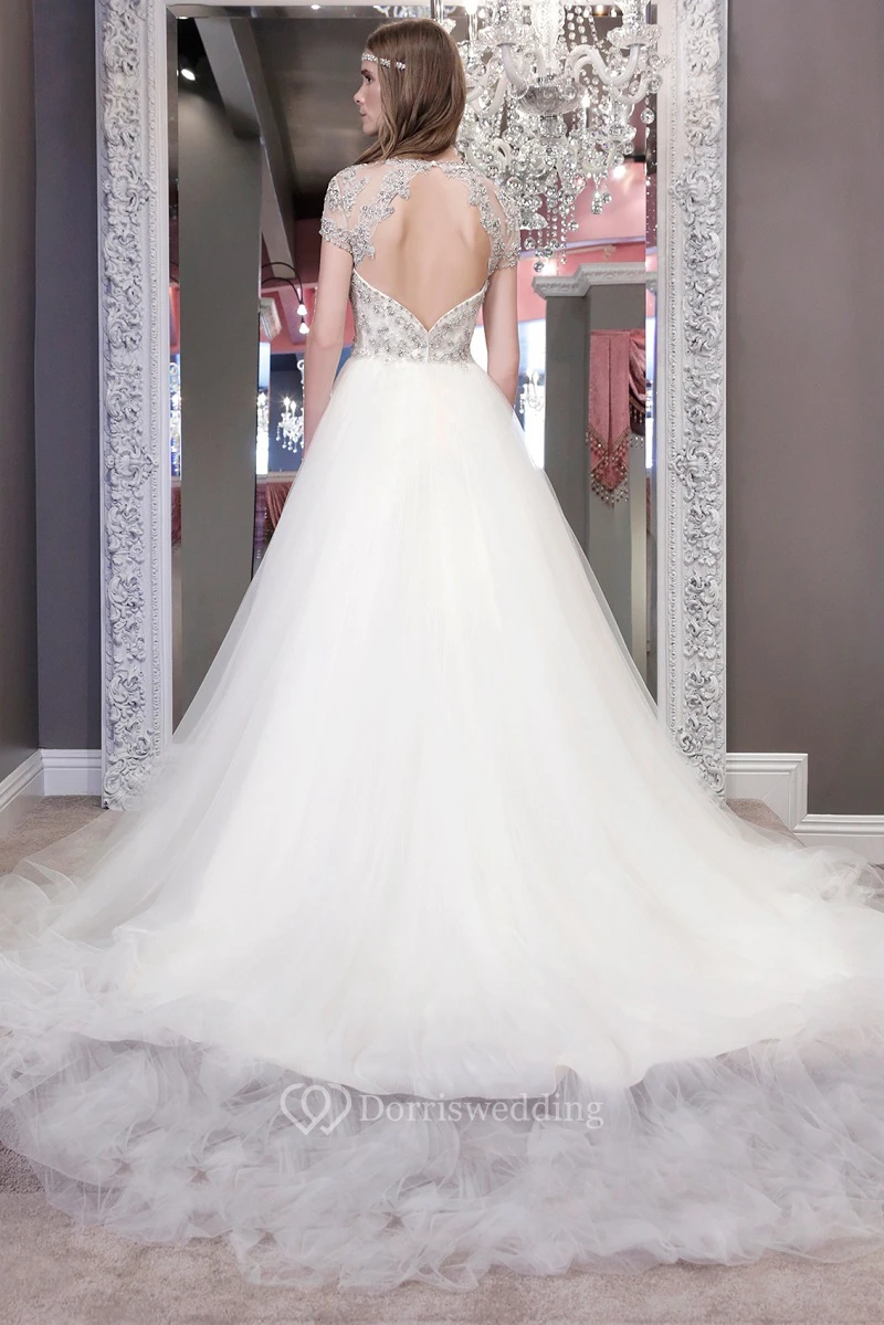 Ball-Gown Bateau Short-Sleeve Long Beaded Tulle Wedding Dress With Keyhole Back And Ruffles