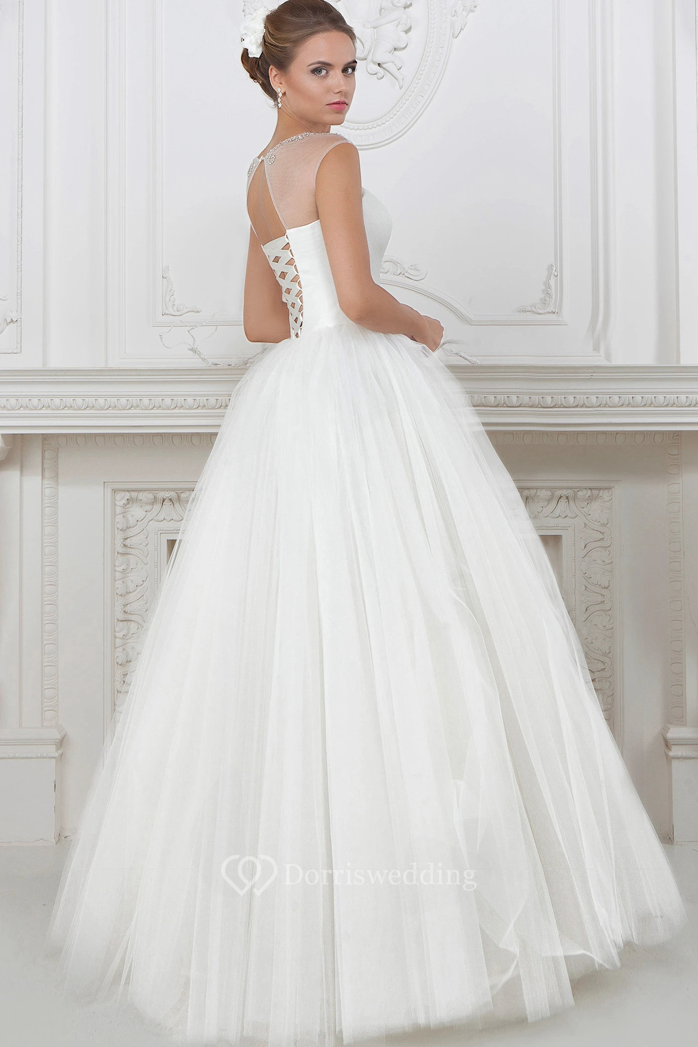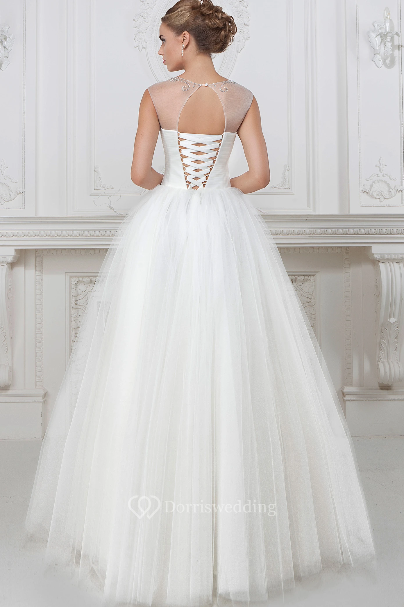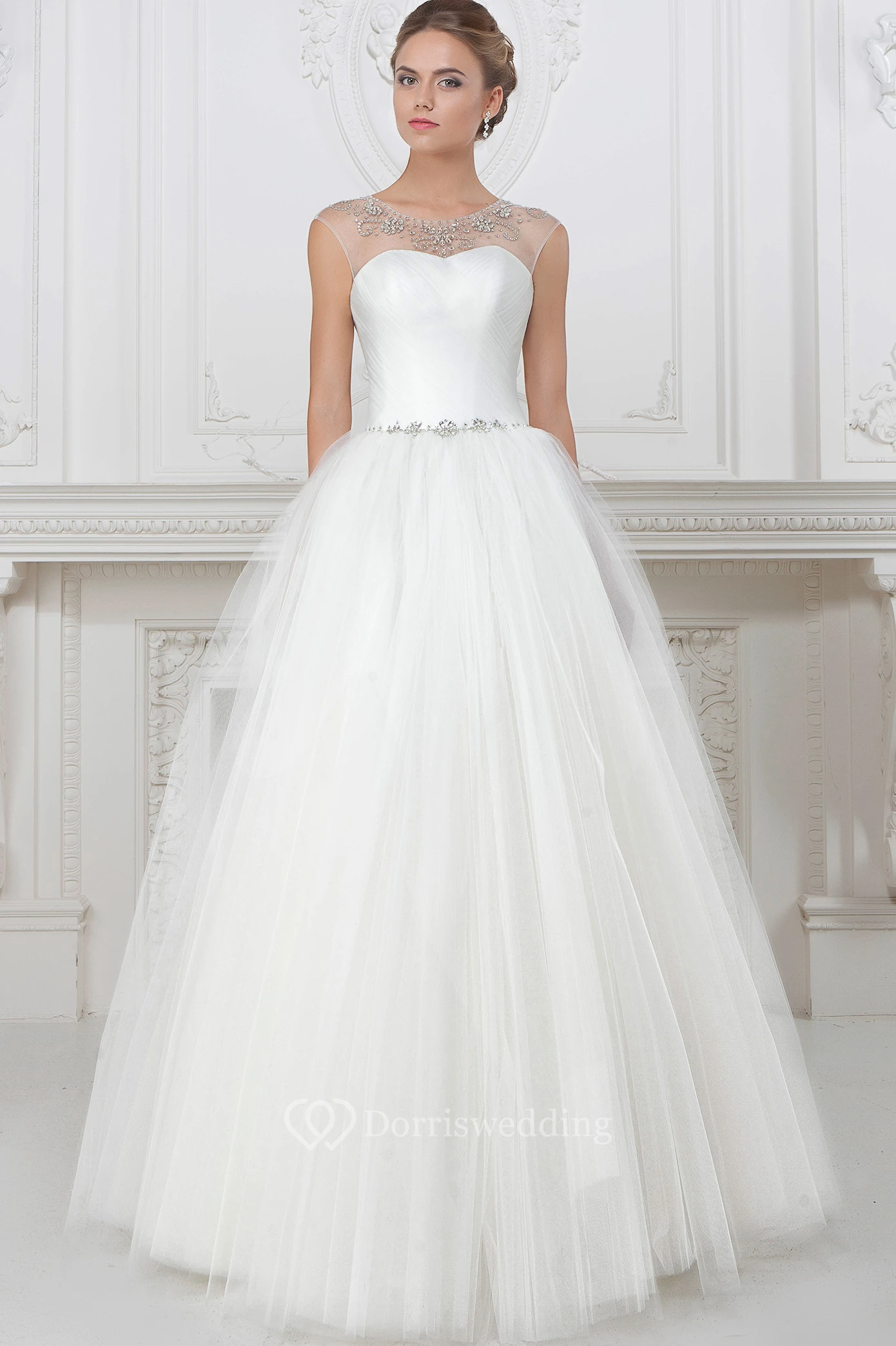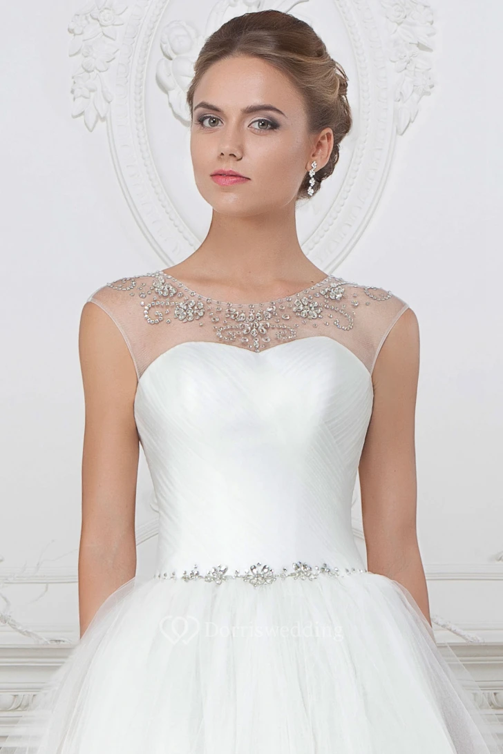 Ball Gown Beaded Floor-Length Scoop-Neck Tulle Wedding Dress With Pleats And Ruching