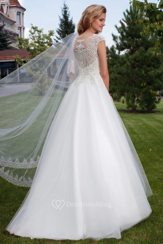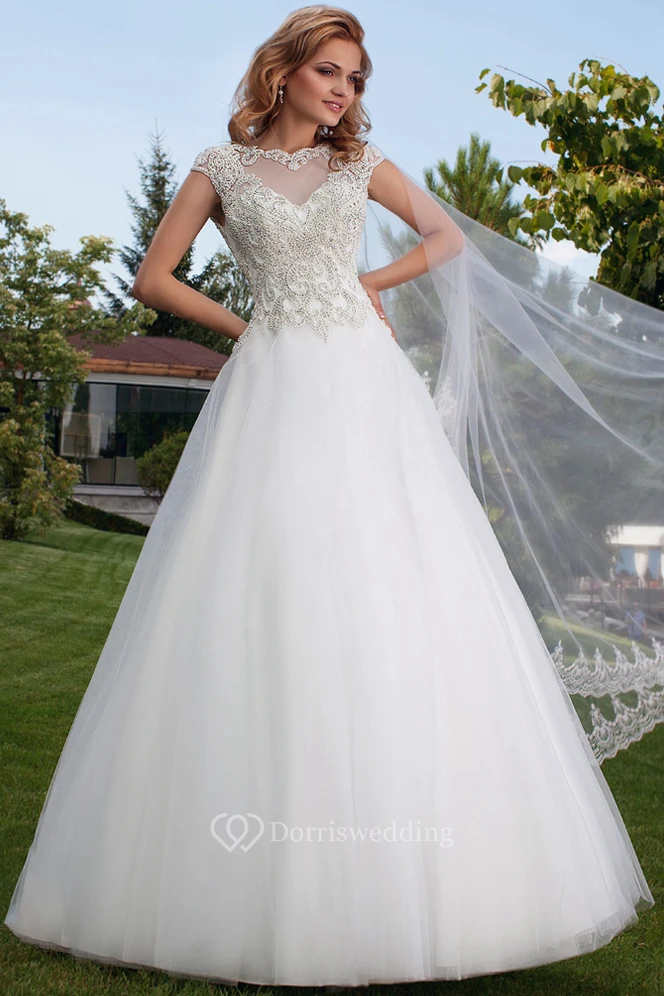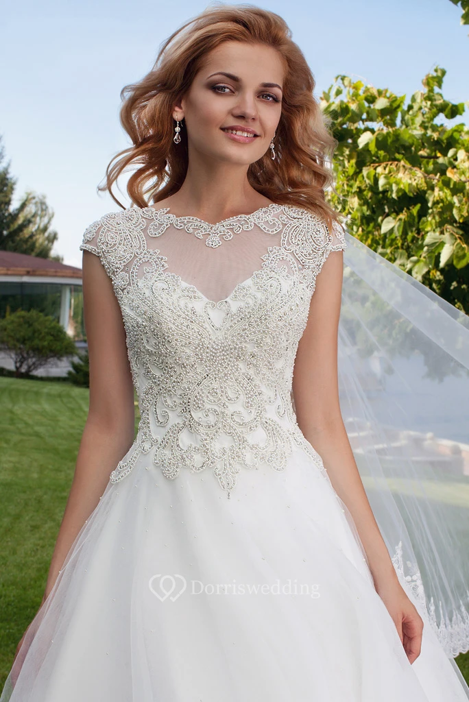 Ball Gown Cap Sleeve Bateau Neck Appliqued Tulle Wedding Dress
