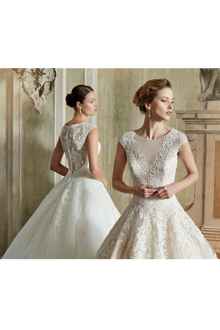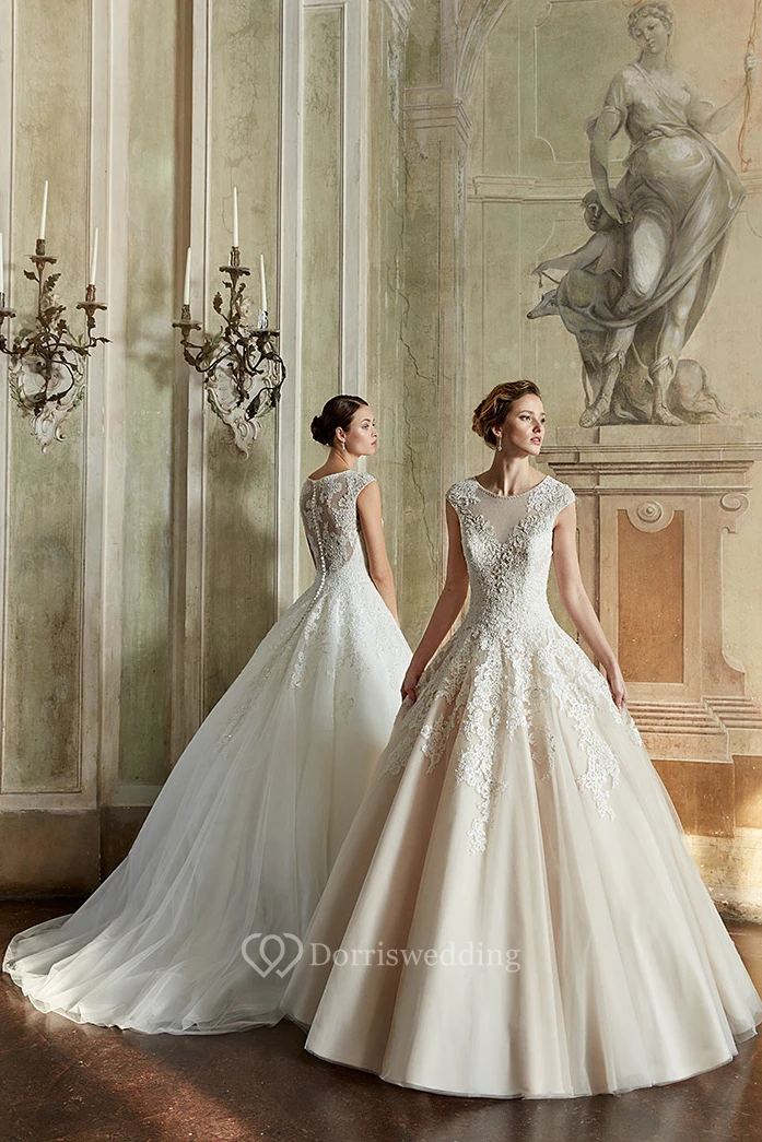 Ball Gown Cap-Sleeve Scoop-Neck Floor-Length Appliqued Lace&Satin Wedding Dress