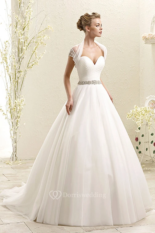 Ball Gown Caped Long Sweetheart Tulle Wedding Dress With Waist Jewellery And Criss Cross