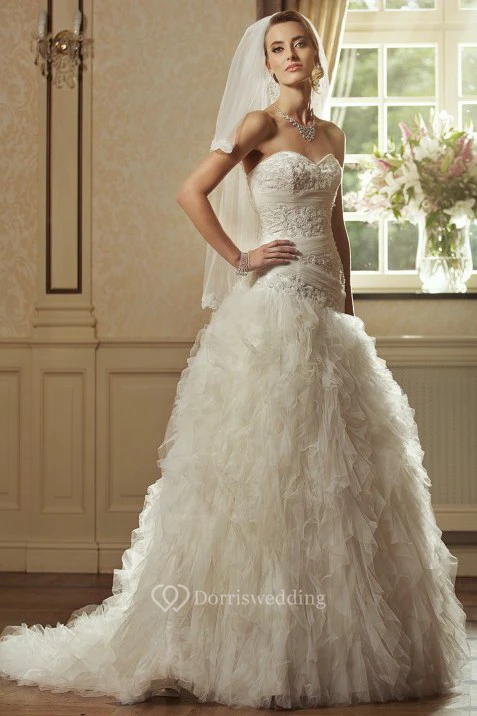 Ball Gown Cascading-Ruffle Sweetheart Floor-Length Sleeveless Tulle Wedding Dress With Beading