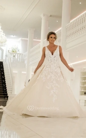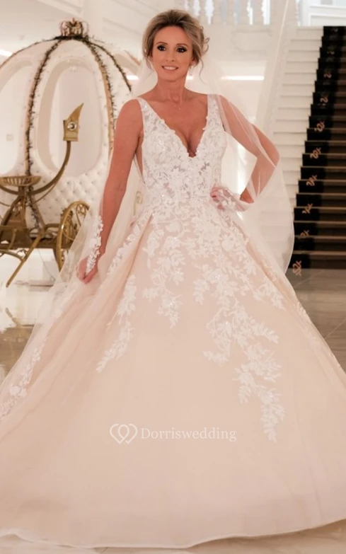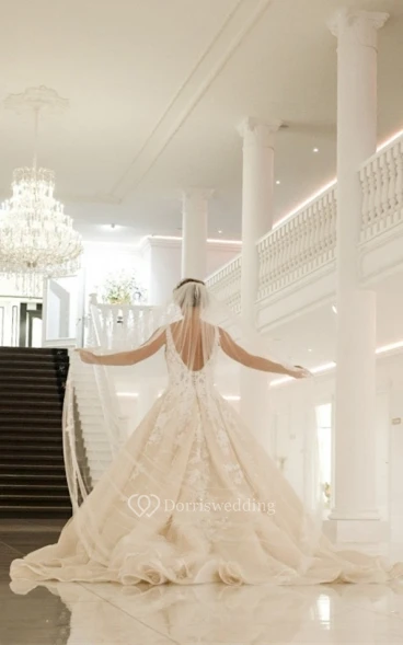 Ball Gown Ethereal Tulle V-neck Lace Wedding Dress with Appliques