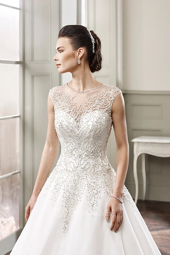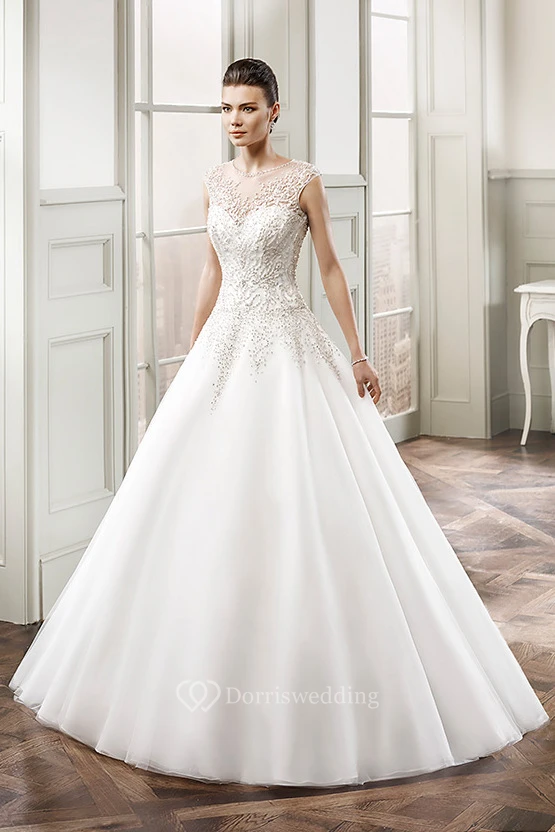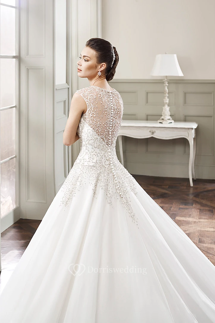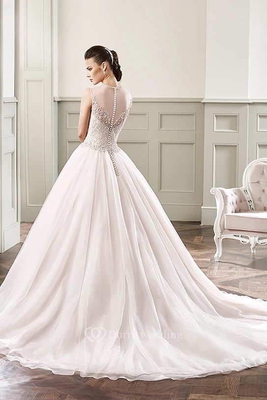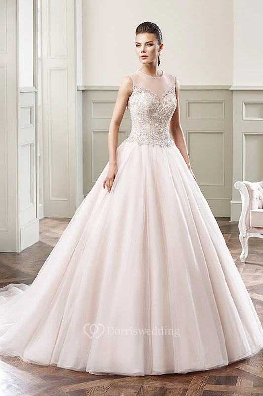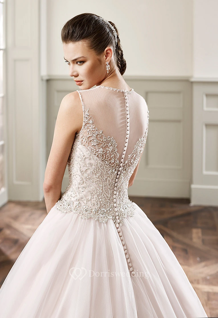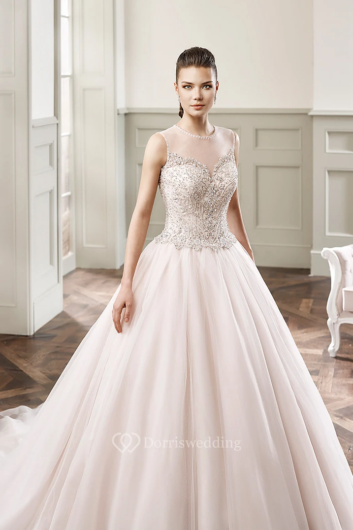 Ball Gown Floor-Length Beaded Scoop-Neck Sleeveless Tulle Wedding Dress