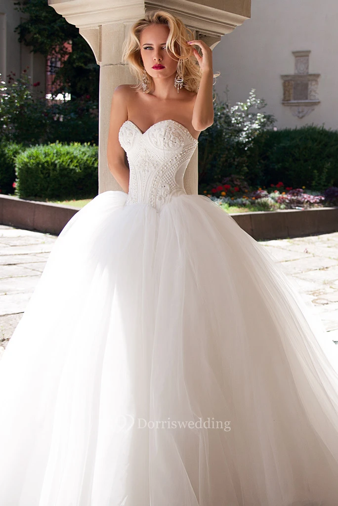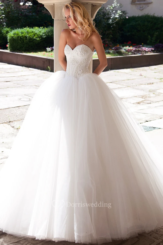 Ball Gown Floor-Length Beaded Sweetheart Sleeveless Tulle Wedding Dress
