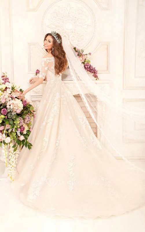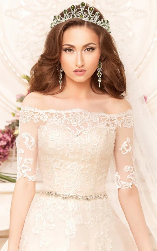 Ball Gown Floor-Length Off-The-Shoulder Half-Sleeve Illusion Lace Dress With Appliques And Waist Jewellery