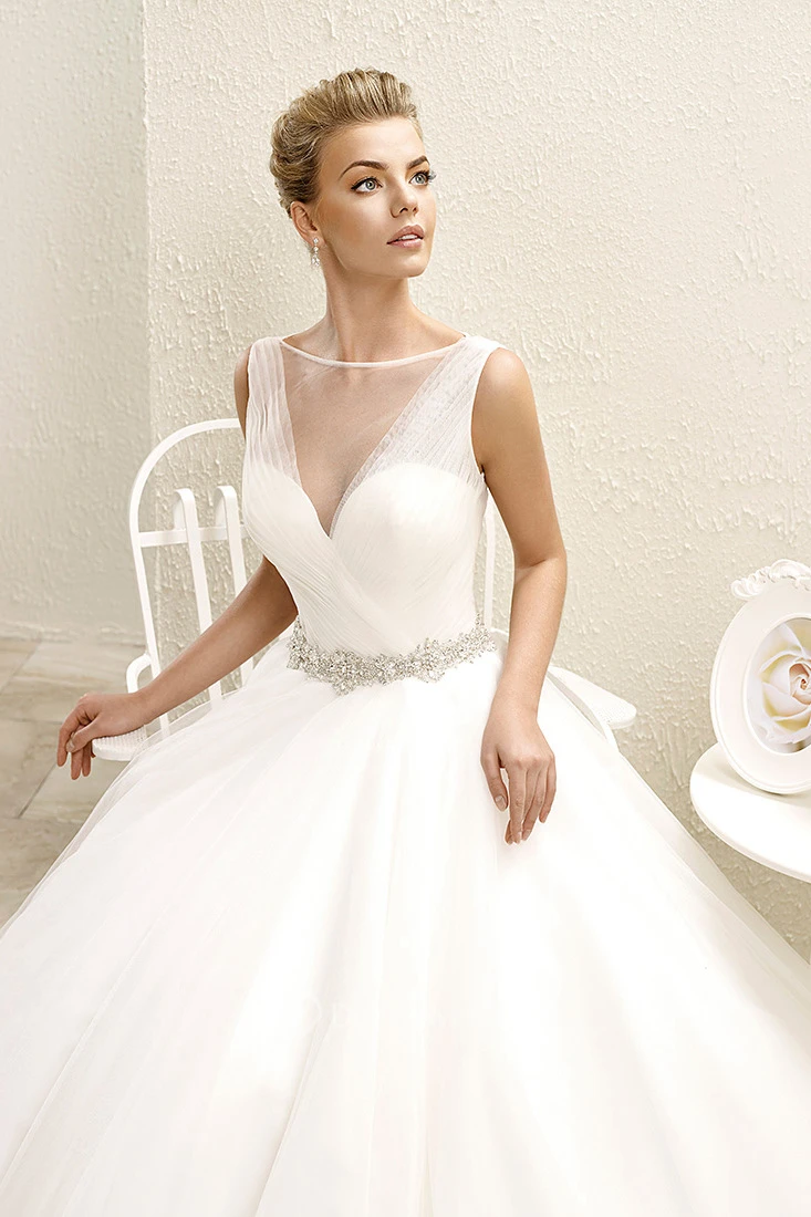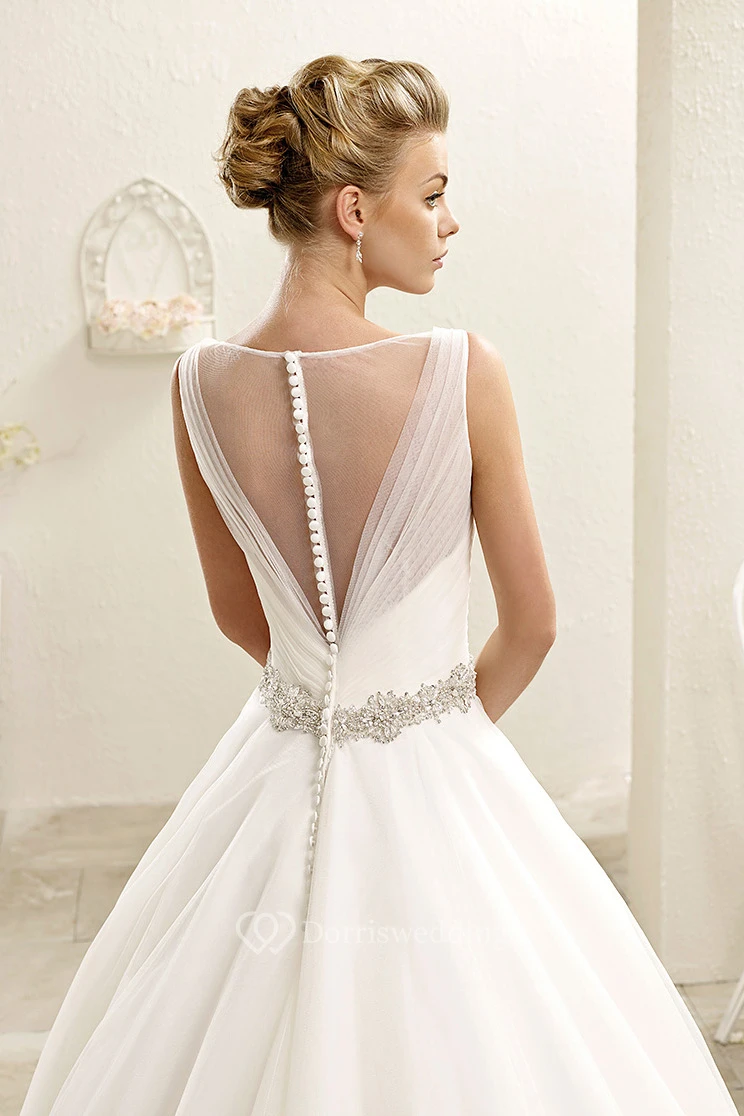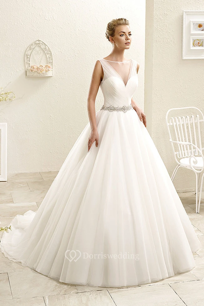 Ball Gown Floor-Length Ruched Bateau-Neck Sleeveless Tulle Wedding Dress With Waist Jewellery