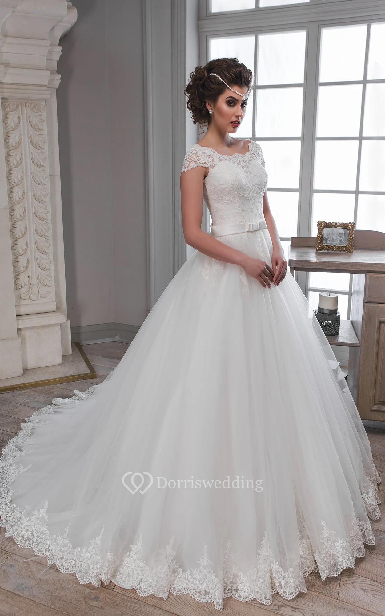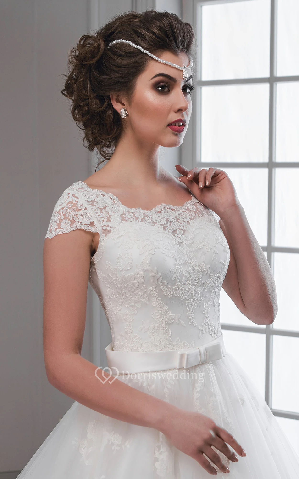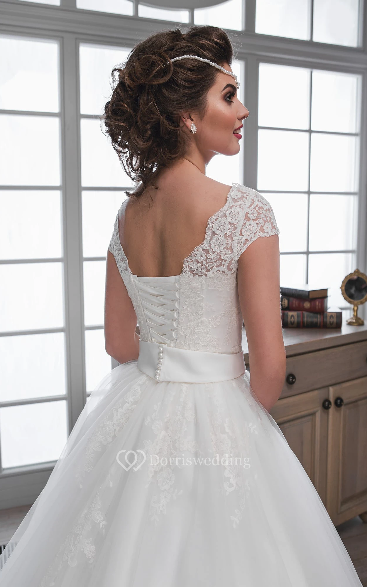 Ball Gown Floor-Length Scoop Cap-Sleeve Corset-Back Tulle Lace Dress