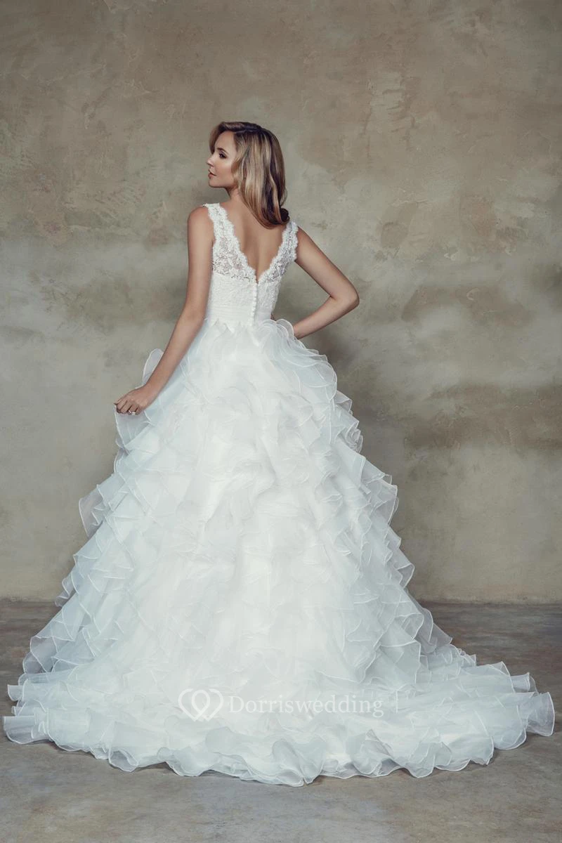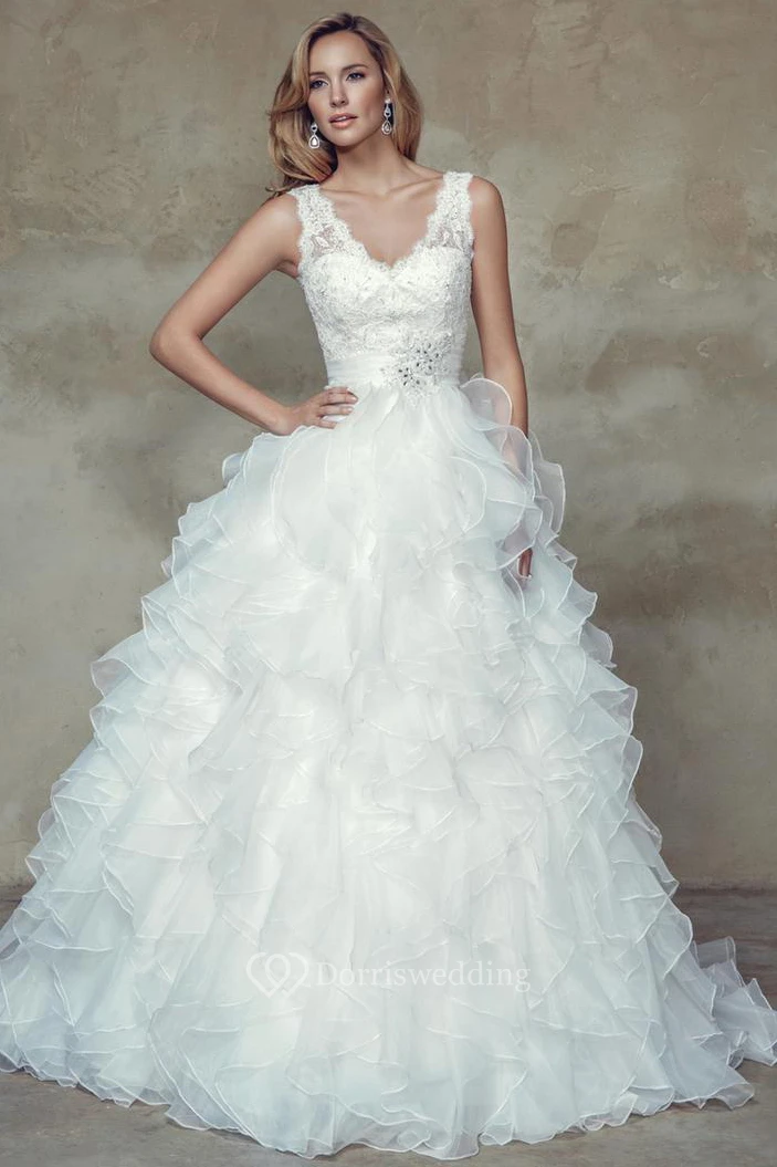 Ball-Gown Floor-Length V-Neck Appliqued Sleeveless Organza Wedding Dress With Cascading Ruffles And Low-V Back
