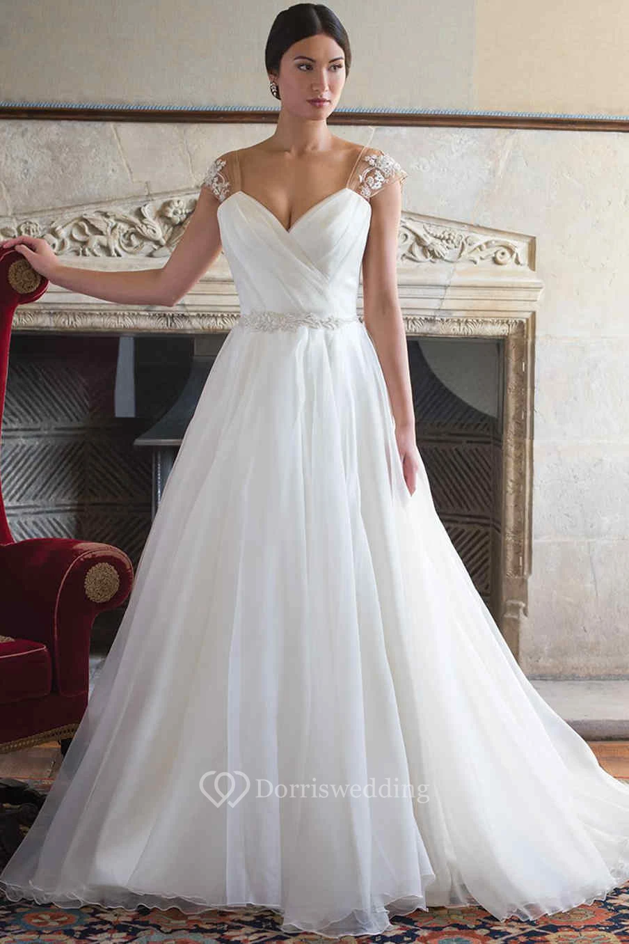 Ball Gown Floor-Length V-Neck Ruched Cap-Sleeve Wedding Dress With Appliques