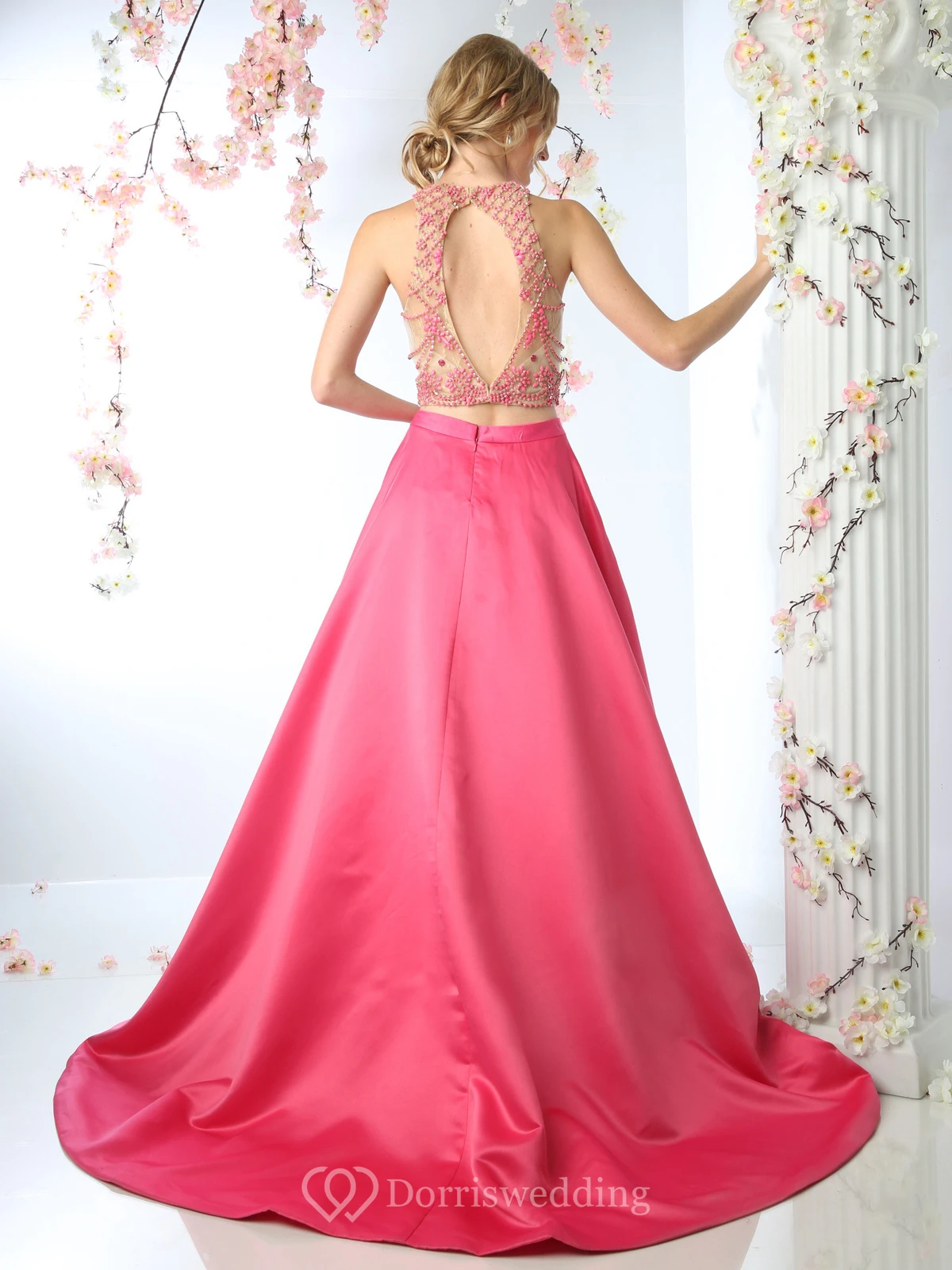Ball Gown Jewel-Neck Sleeveless Satin Court Train Keyhole Dress With Beading