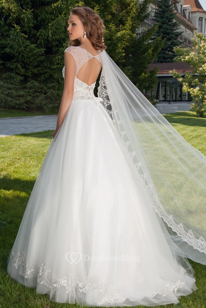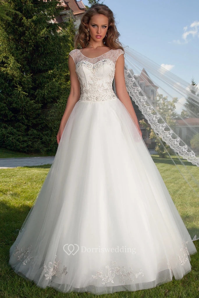 Ball Gown Jeweled Scoop-Neck Sleeveless Tulle Wedding Dress With Cape