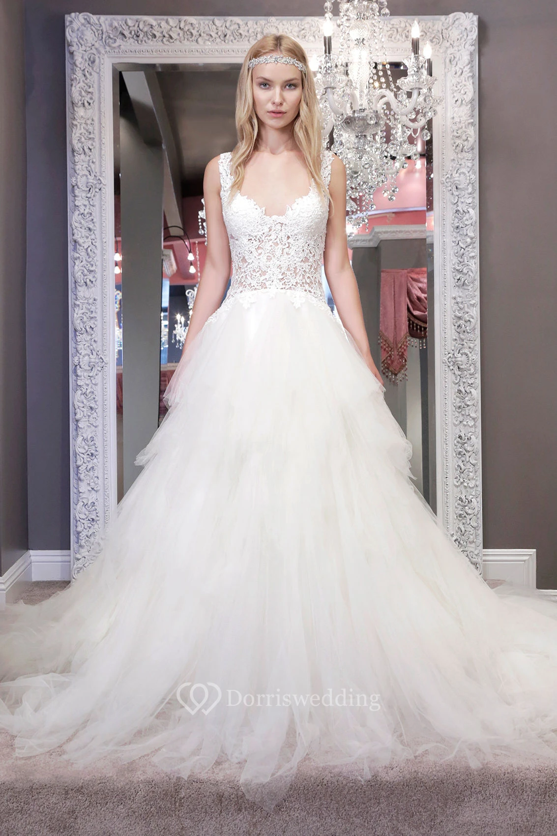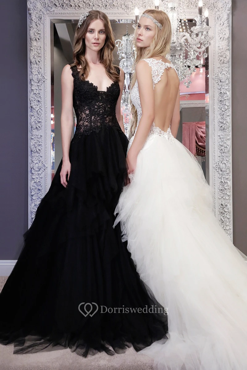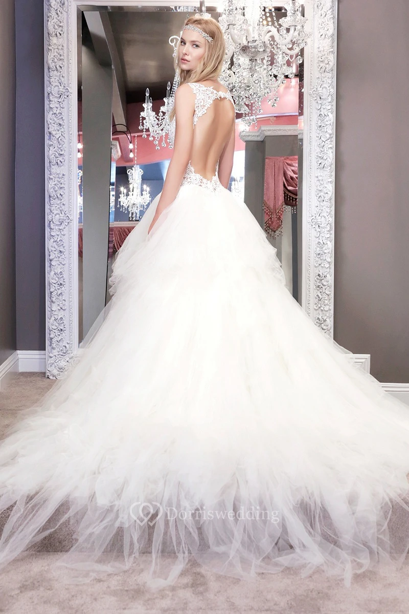 Ball-Gown Lace Long V-Neck Sleeveless Tulle Wedding Dress With Backless Style And Ruffles