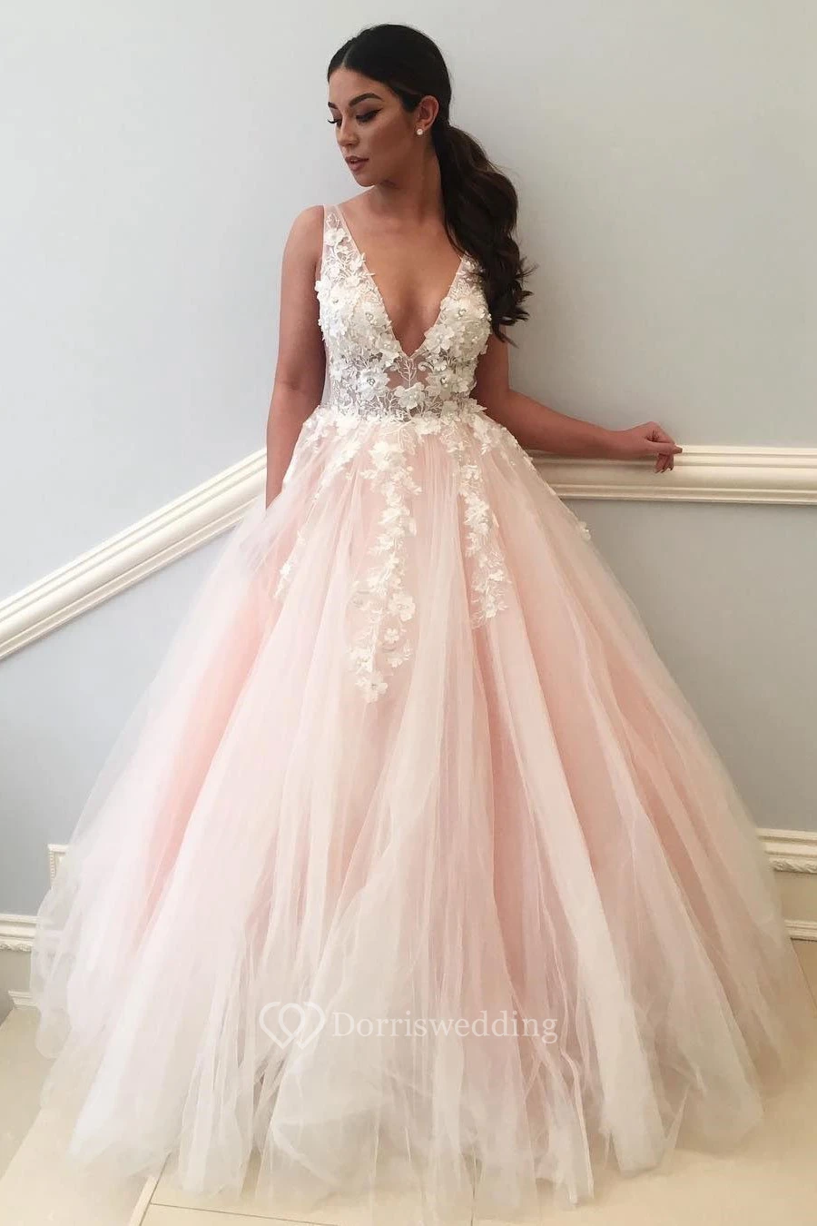 Ball Gown Lace Tulle V-neck Sleeveless Zipper Low-V Back Dress
