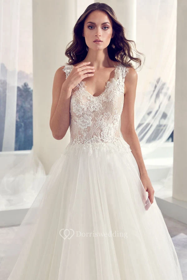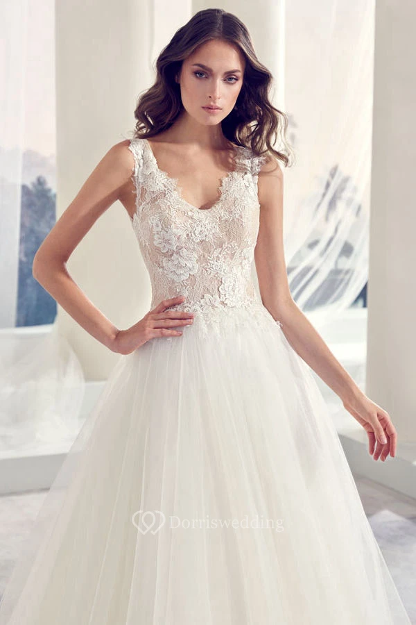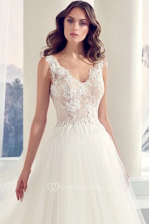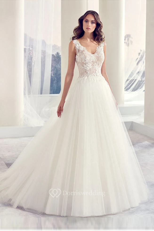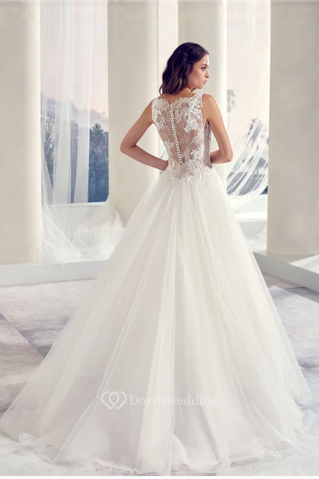 Ball-Gown Long Appliqued Sleeveless V-Neck Tulle Wedding Dress With Illusion Back And Pleats
