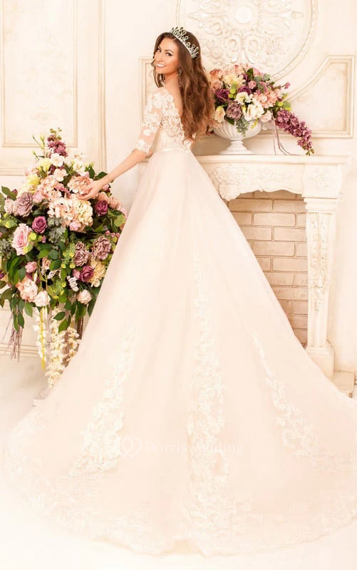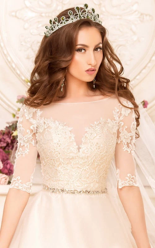 Ball Gown Long Bateau Half-Sleeve Deep-V-Back Lace Dress With Appliques And Waist Jewellery