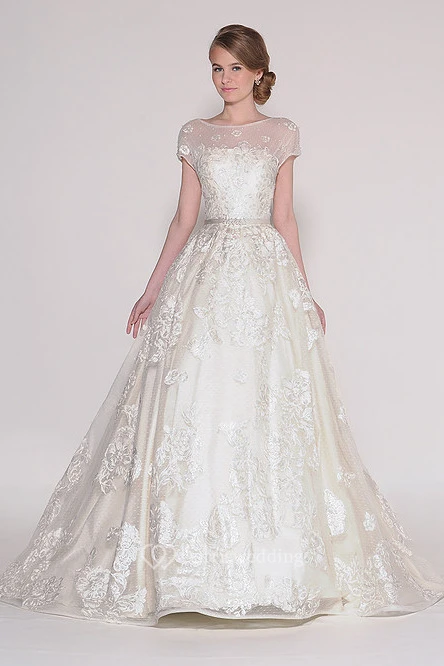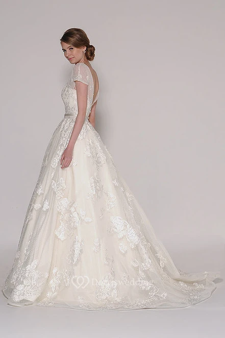Ball Gown Long Bateau-Neck Short-Sleeve Lace Wedding Dress With Appliques And V Back