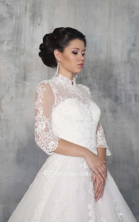 Ball Gown Long High-Neck 3-4-Sleeve Illusion Tulle Dress With Appliques