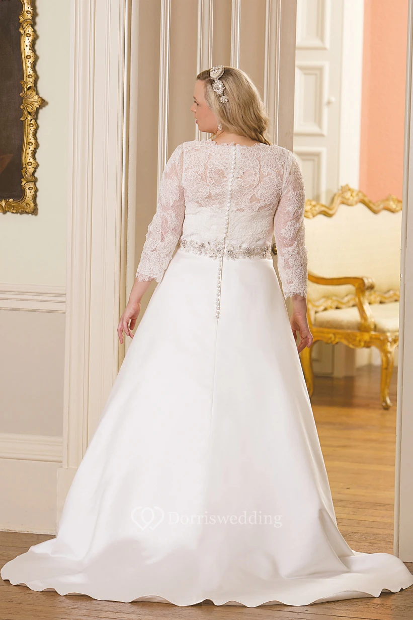 Ball Gown Long Long-Sleeve Bateau-Neck Jeweled Satin Plus Size Wedding Dress With Appliques And Illusion
