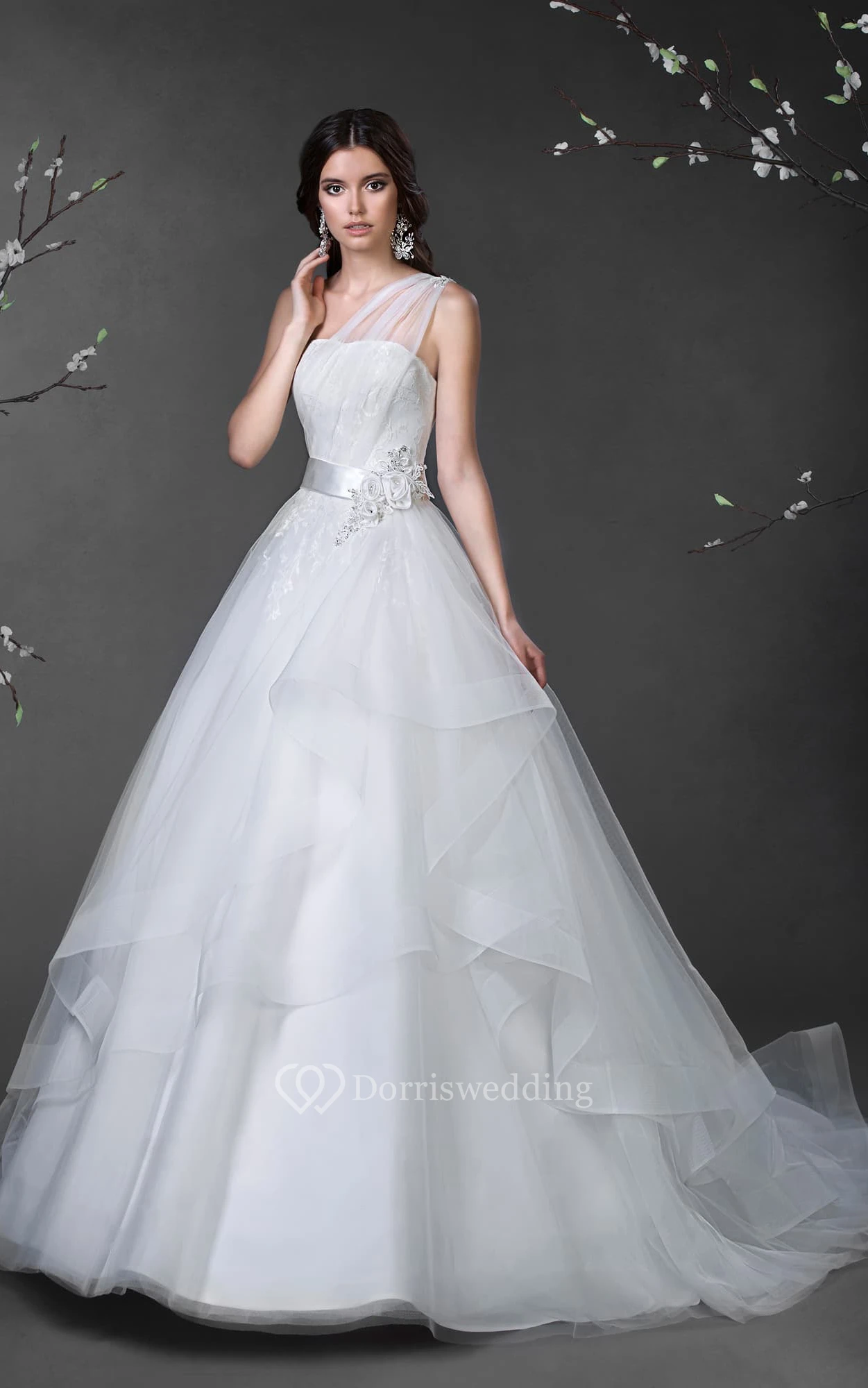 Ball Gown Long One-Shoulder Sleeveless Lace-Up Tulle Satin Dress With Draping And Tiers