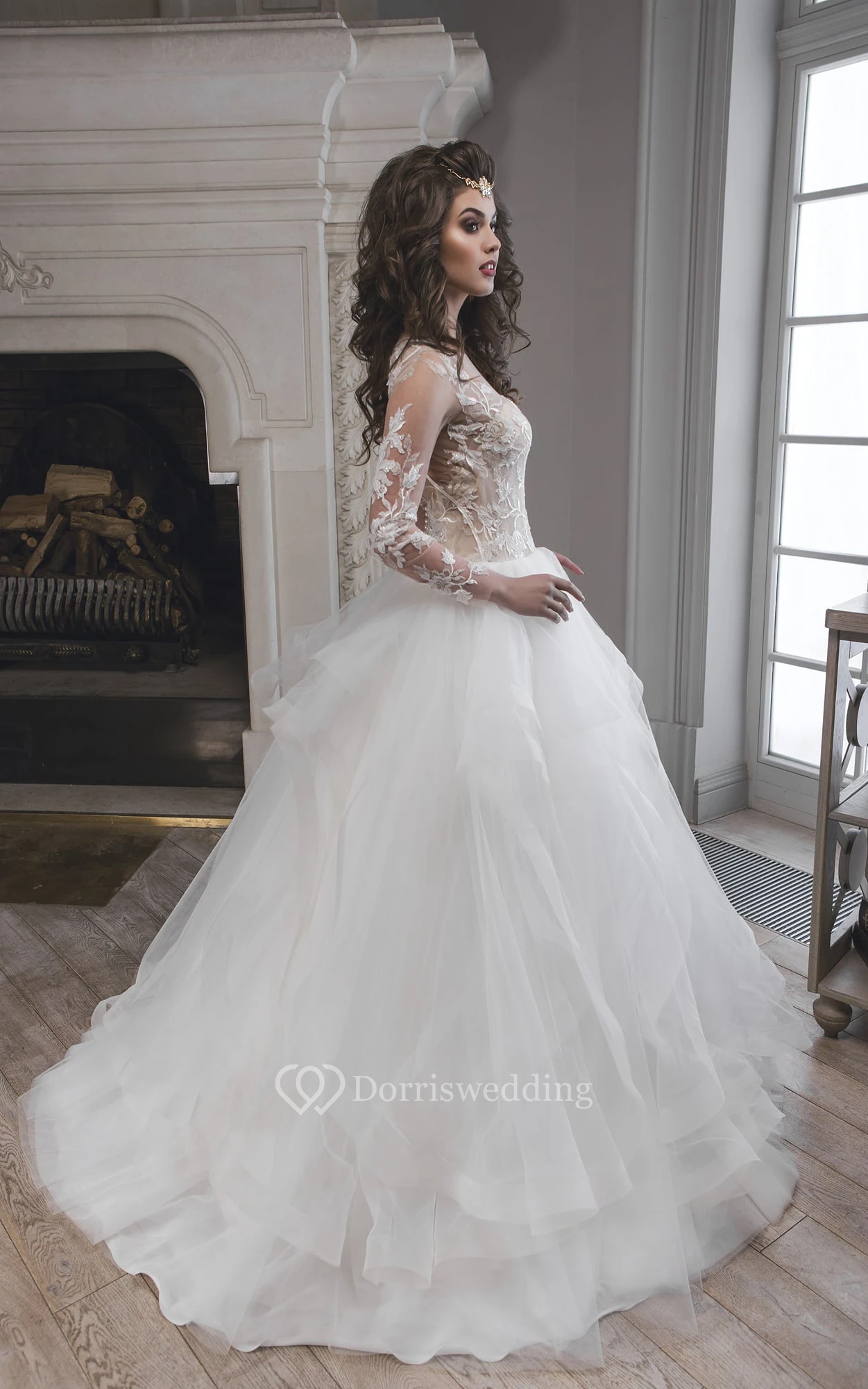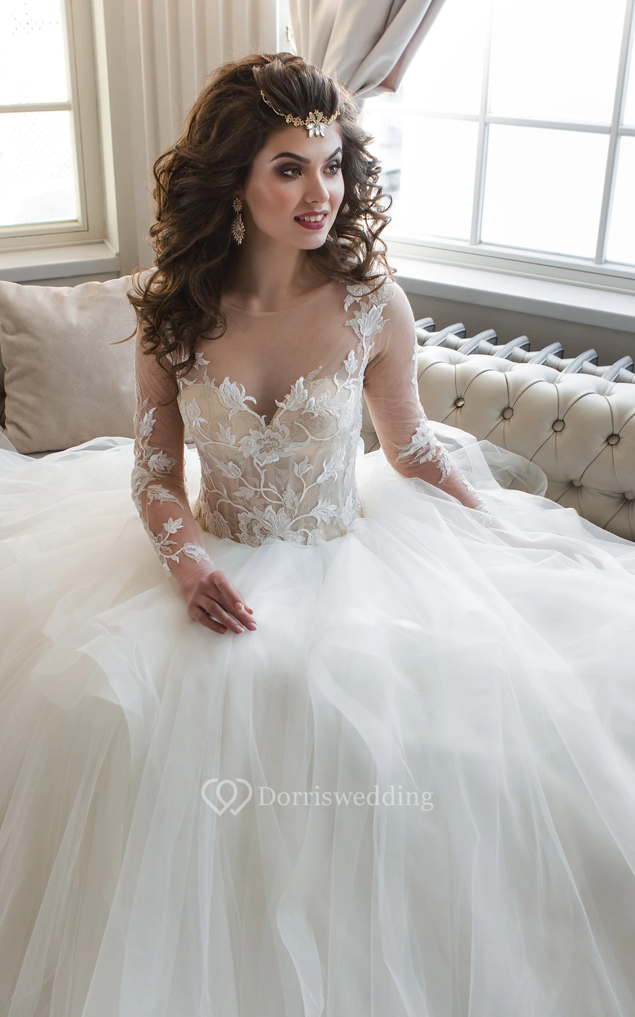Ball Gown Long Scoop Illusion-Sleeve Keyhole Tulle Dress With Appliques And Ruffles