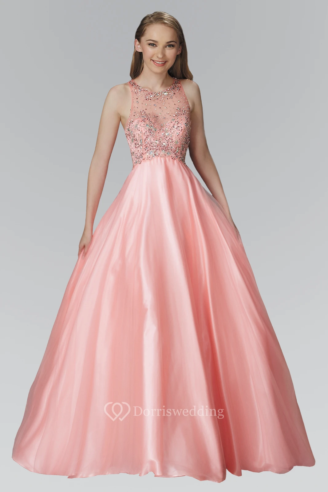 Ball Gown Long Scoop-Neck Sleeveless Satin Illusion Dress With Beading