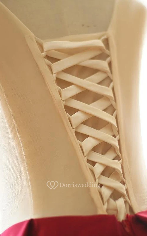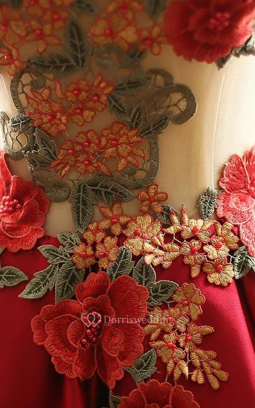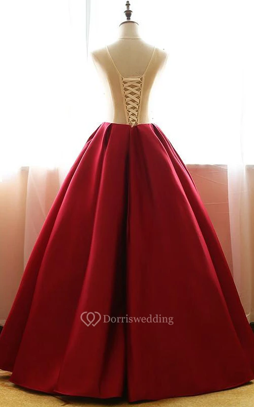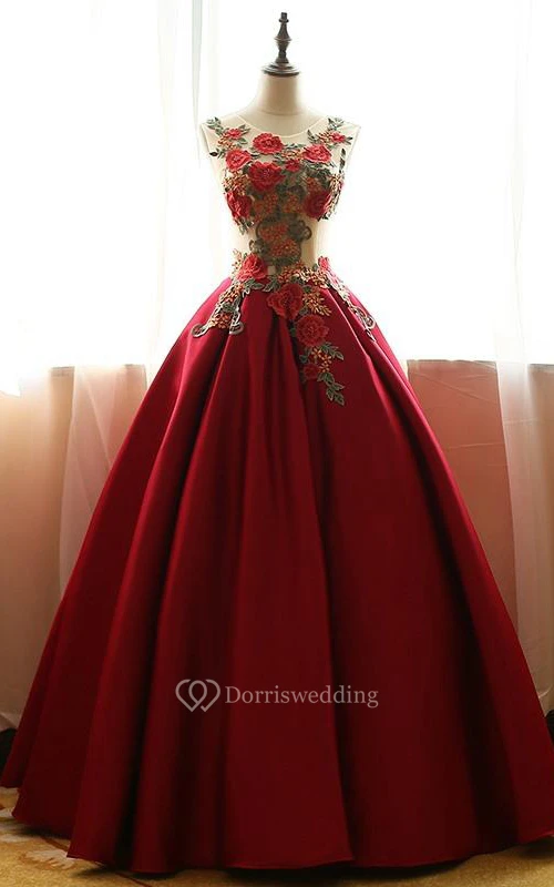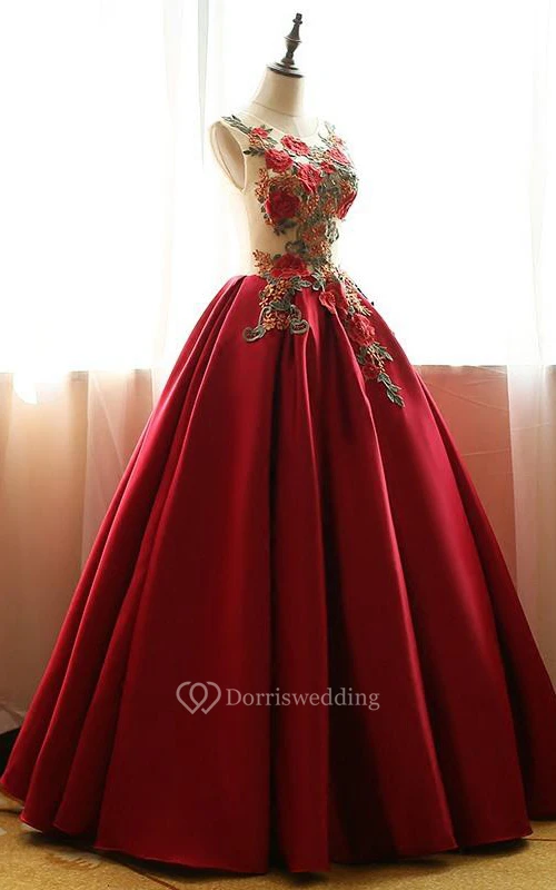 Ball Gown Long Scoop Sleeveless Bell Embroidery Lace-Up Back Lace Satin Dress