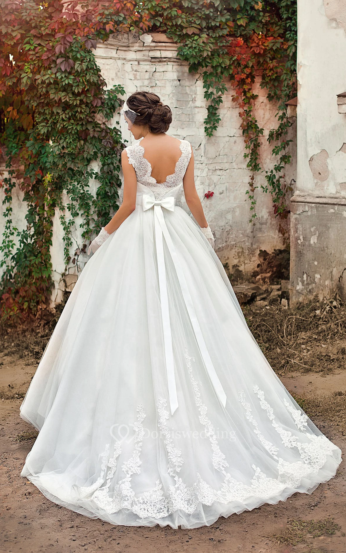 Ball Gown Long Scoop Sleeveless Low-V-Back Satin Lace Dress With Bow