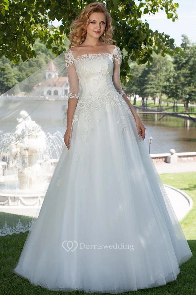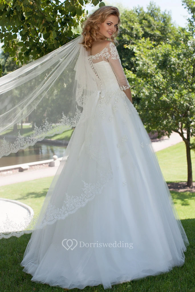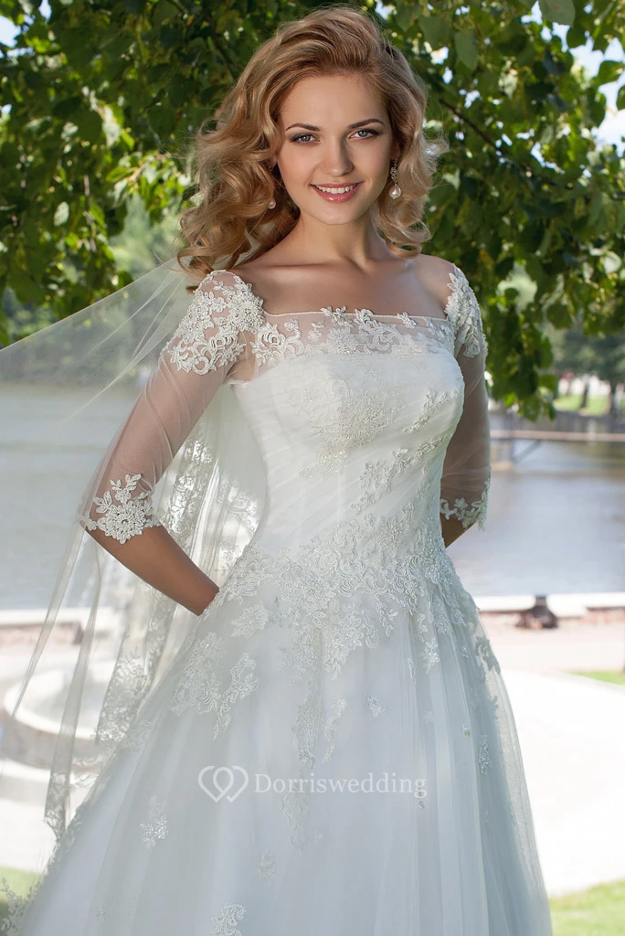 Ball Gown Long Short-Sleeve Square-Neck Tulle Modest Wedding Dress With Appliques And Corset Back