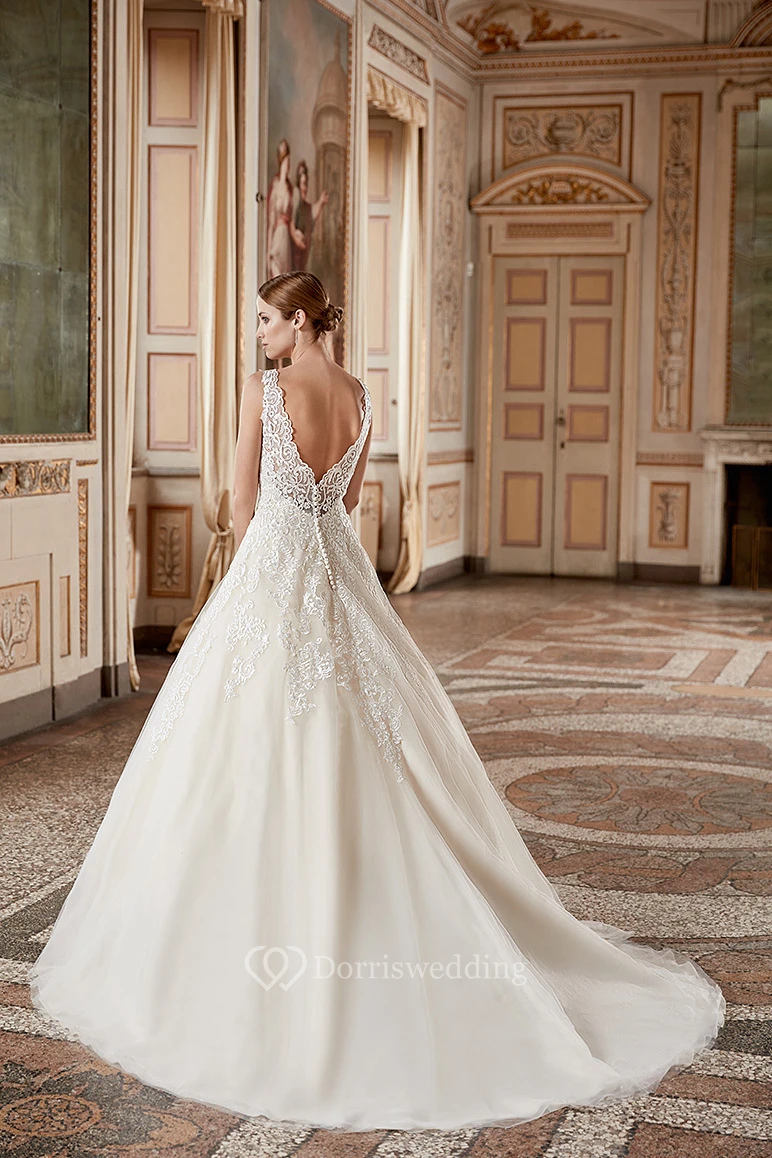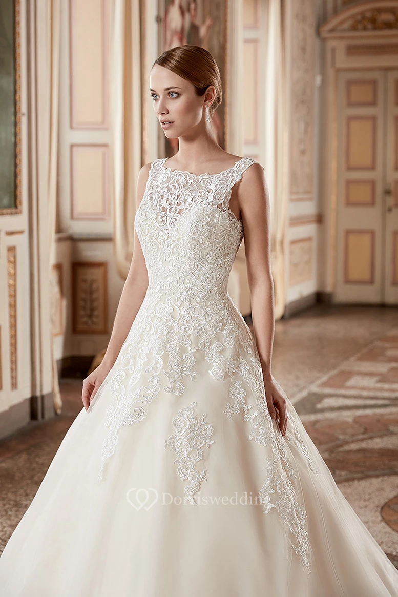 Ball Gown Long Sleeveless Bateau-Neck Appliqued Lace Wedding Dress