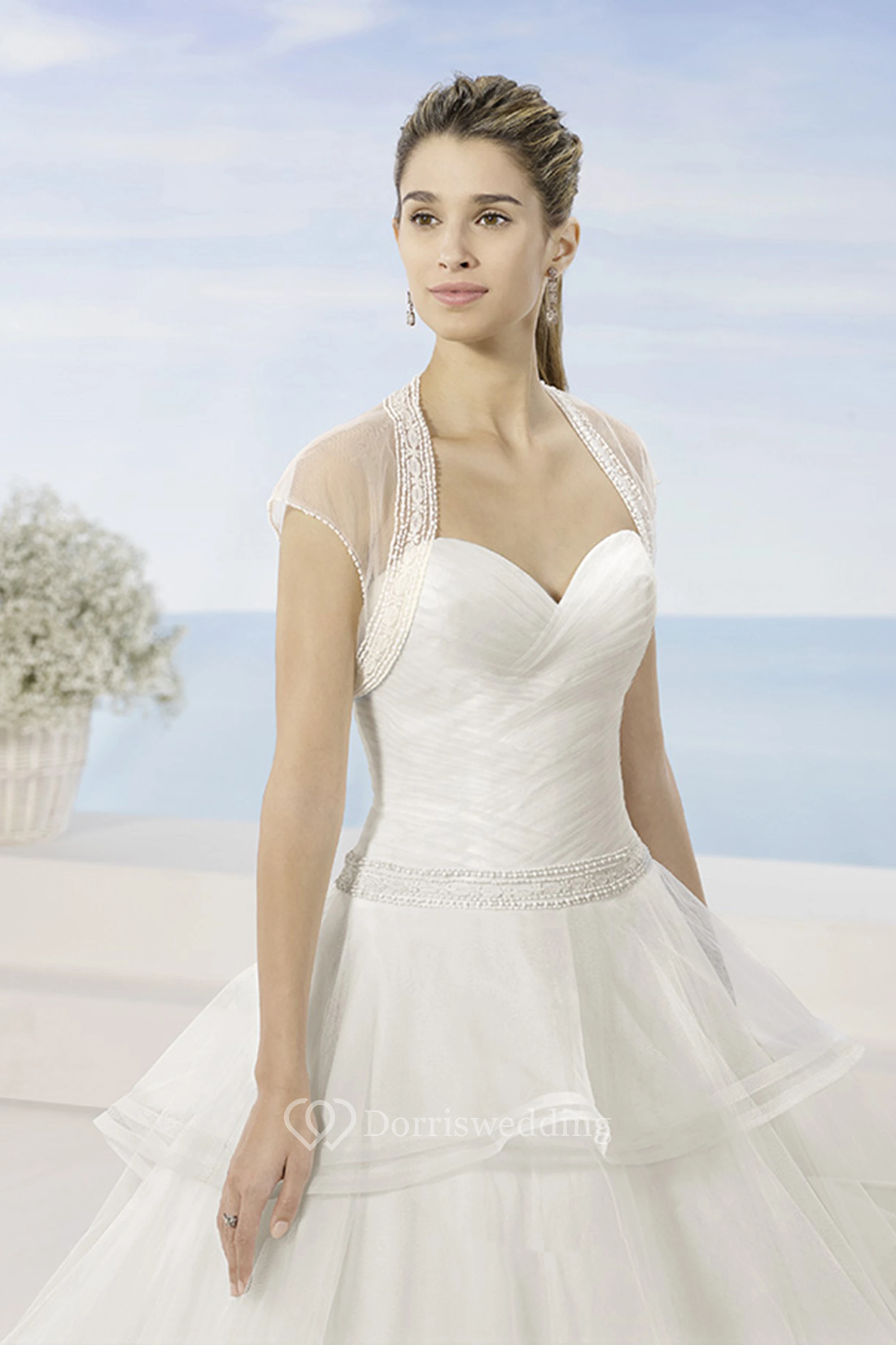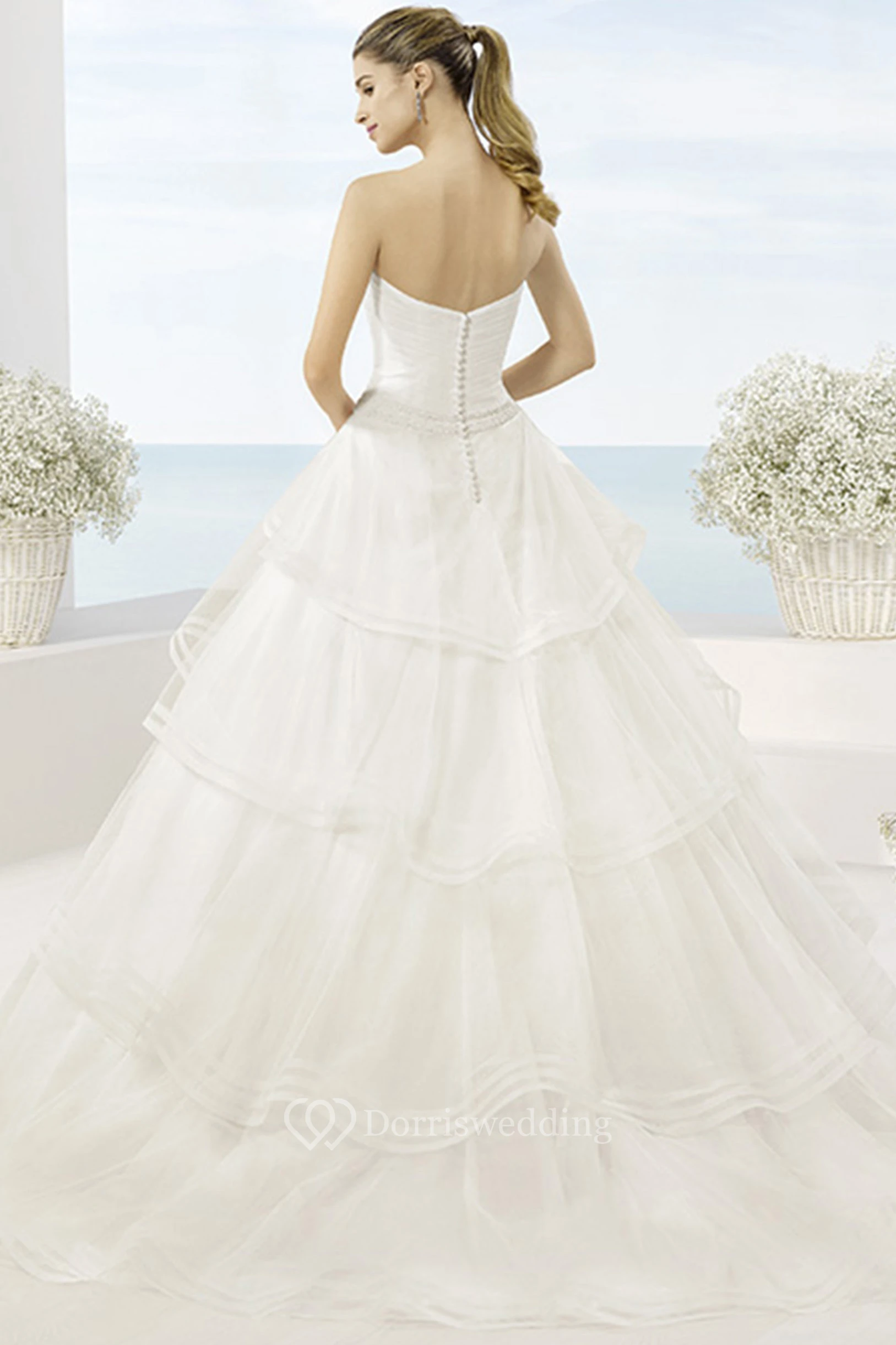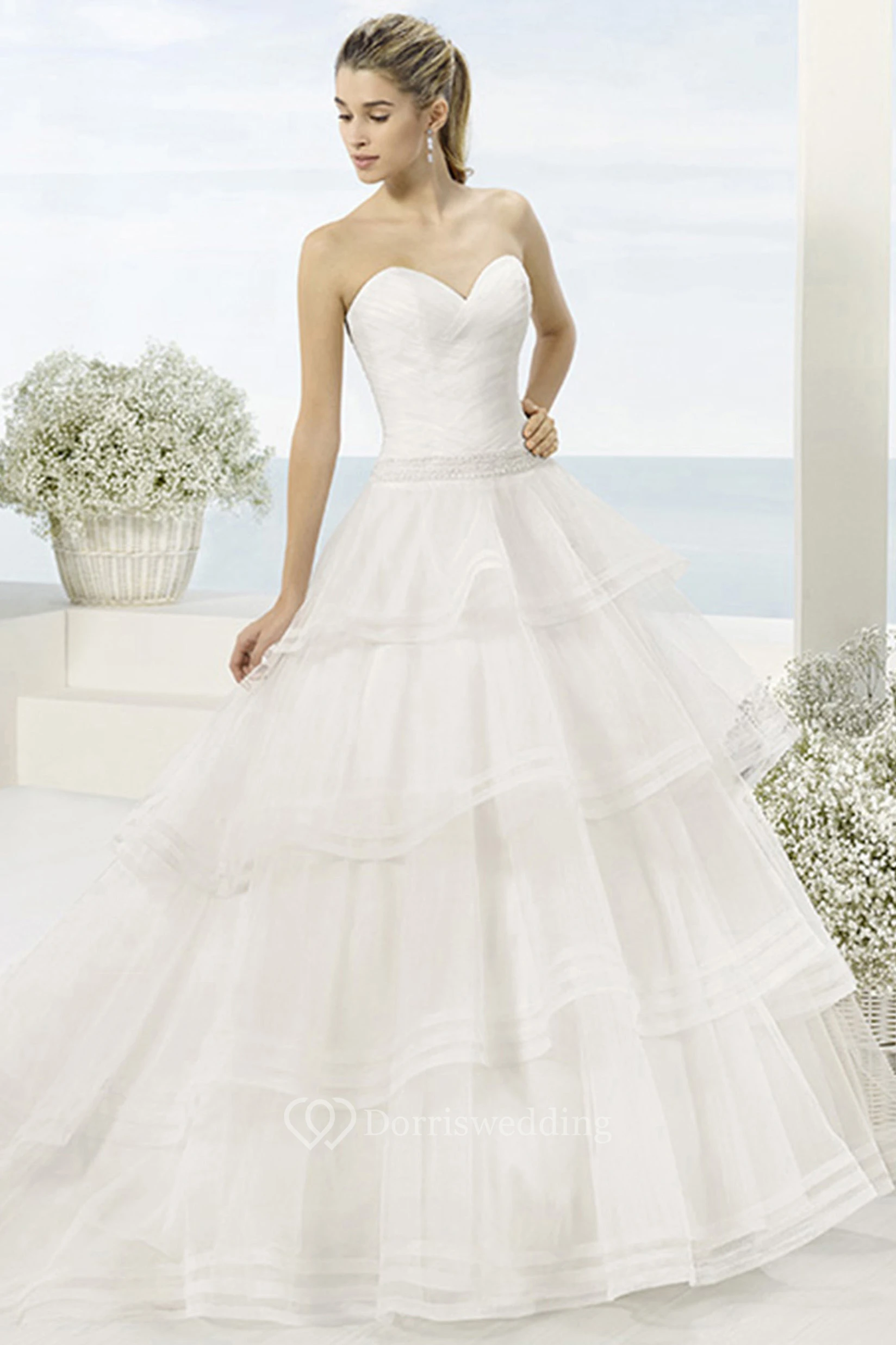 Ball-Gown Long Sweetheart Sleeveless Tiered Tulle Wedding Dress With Cascading Ruffles And Waist Jewellery