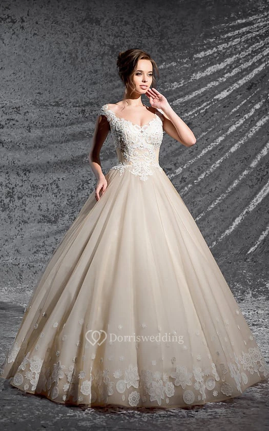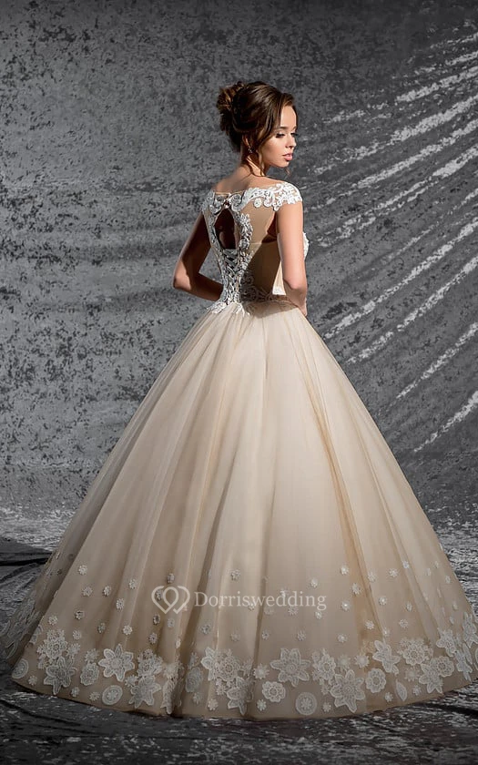 Ball Gown Long V-Neck Cap-Sleeve Keyhole Organza Dress With Appliques And Pleats