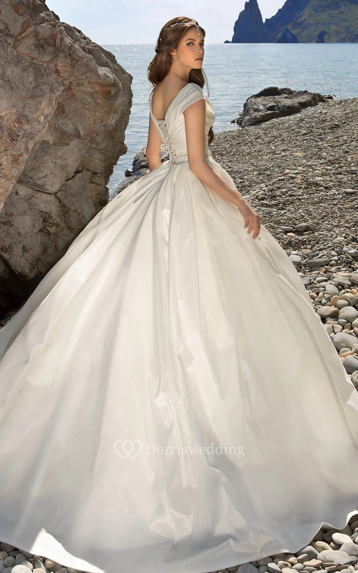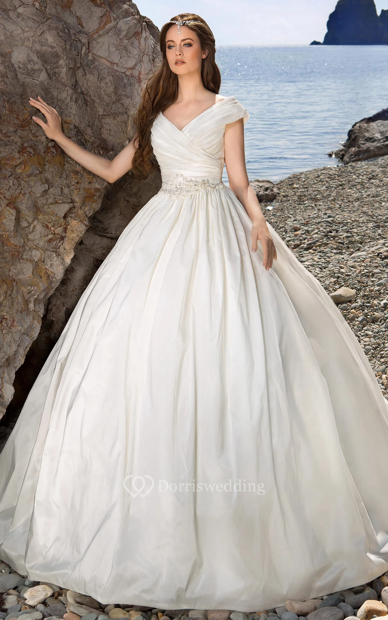 Ball Gown Long V-Neck Cap-Sleeve Lace-Up Satin Dress With Waist Jewellery And Ruching